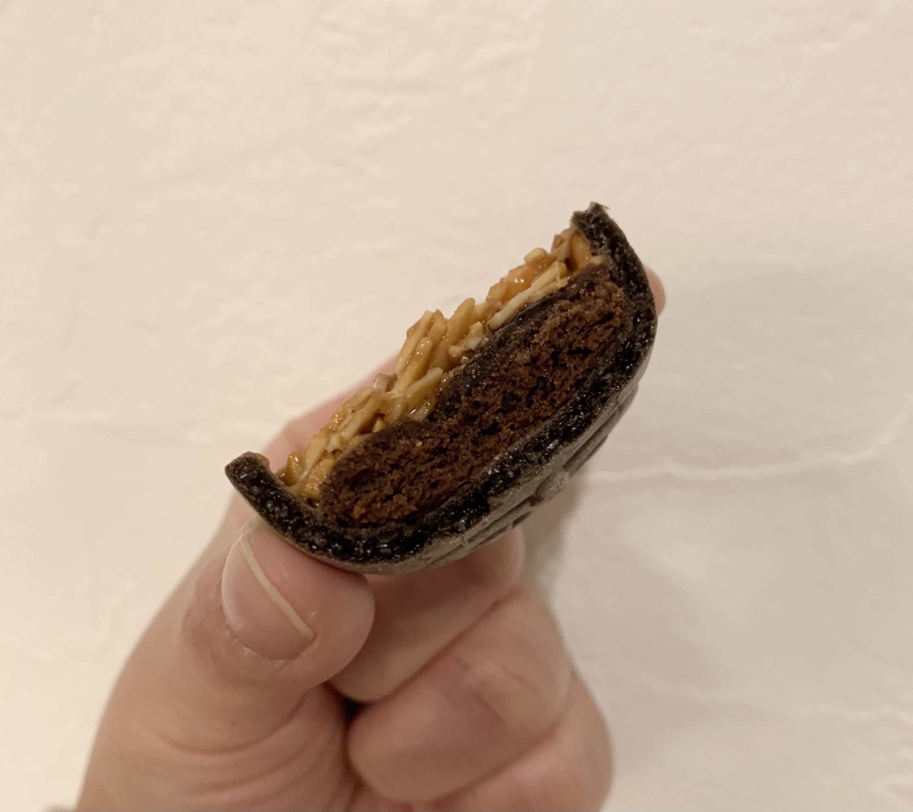 フロランタンといえば、クッキー生地にキャラメルでコーティングしたナッツ類をのせて焼き上げてつくる糖菓ですが、こちらはモナカ+エアリーなチョコレート菓子の上にキャラメルでコーティングしたナッツがトッピングされているようなイメージで、いわゆるフロランタンのようなかたい食感とは異なり、サクッほろっという食感でした。モナカとチョコとキャラメルナッツのバランスがとても良く、一緒に食べた家族からも、今までに食べたことがない味わいで美味しい!と好評でした。