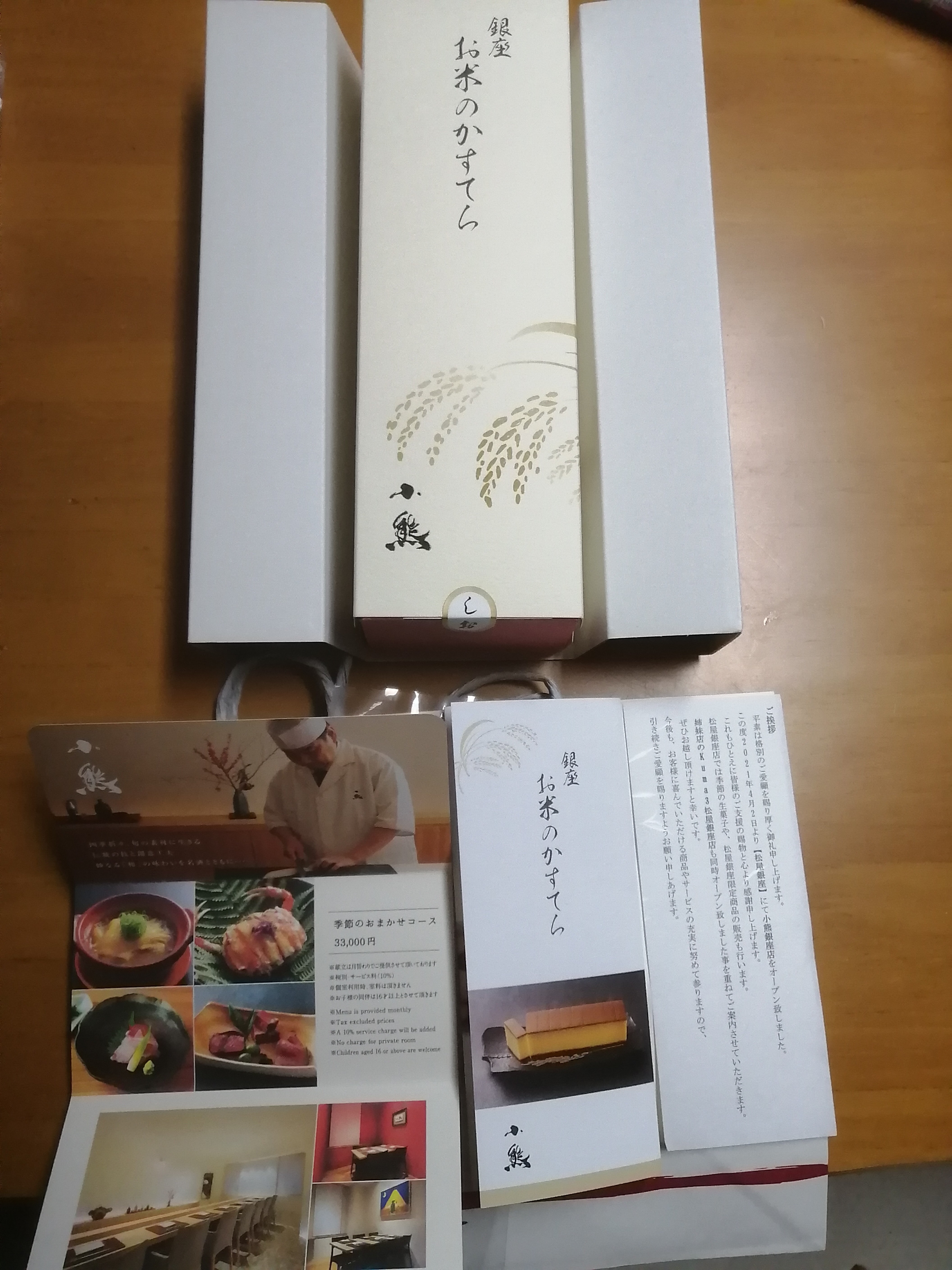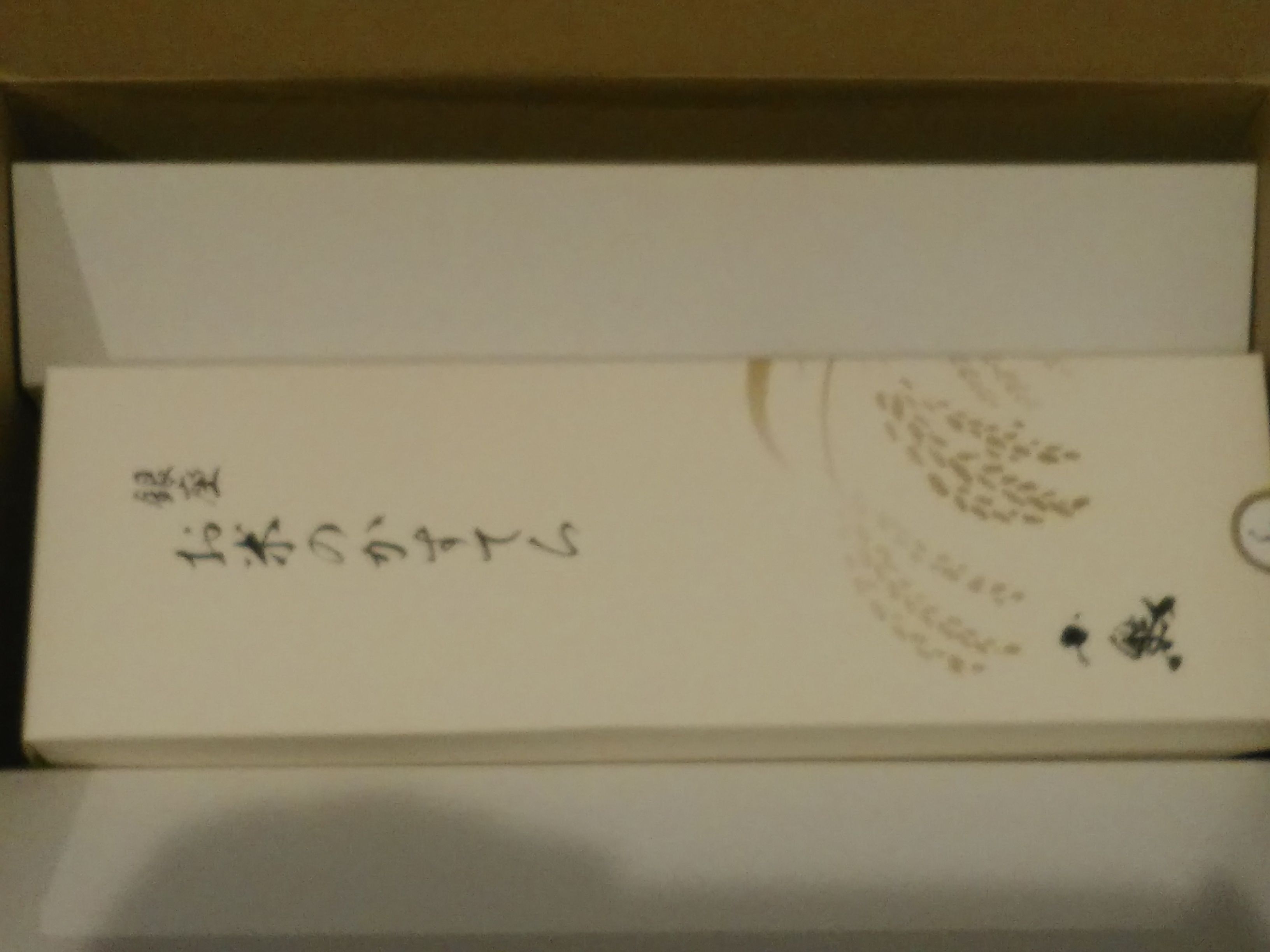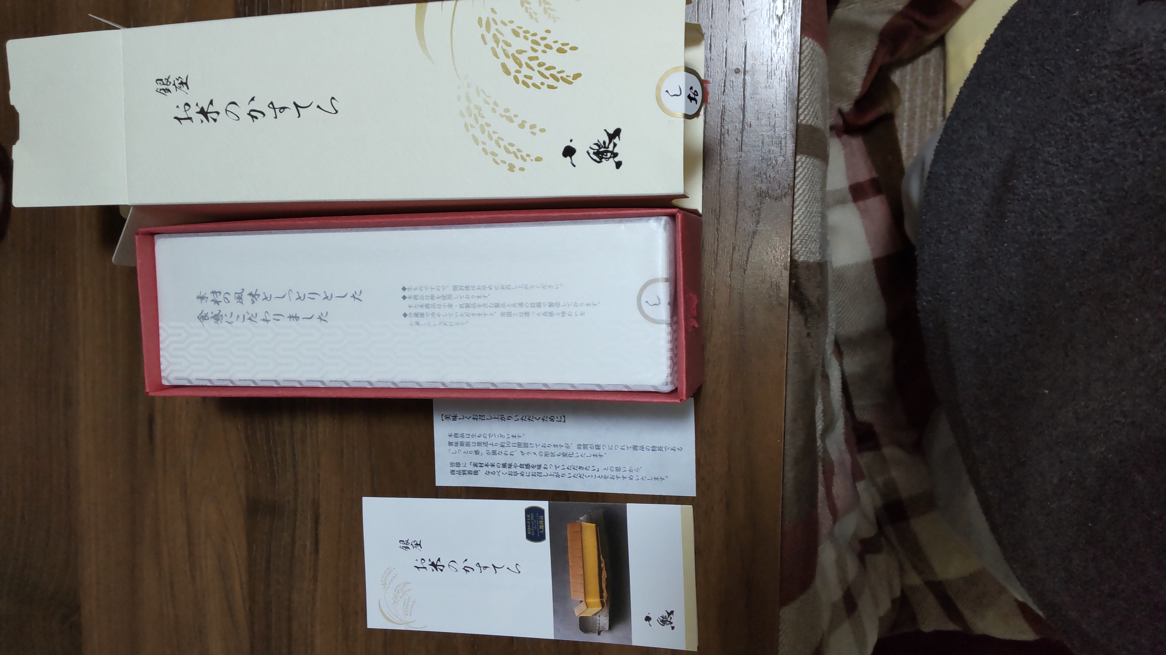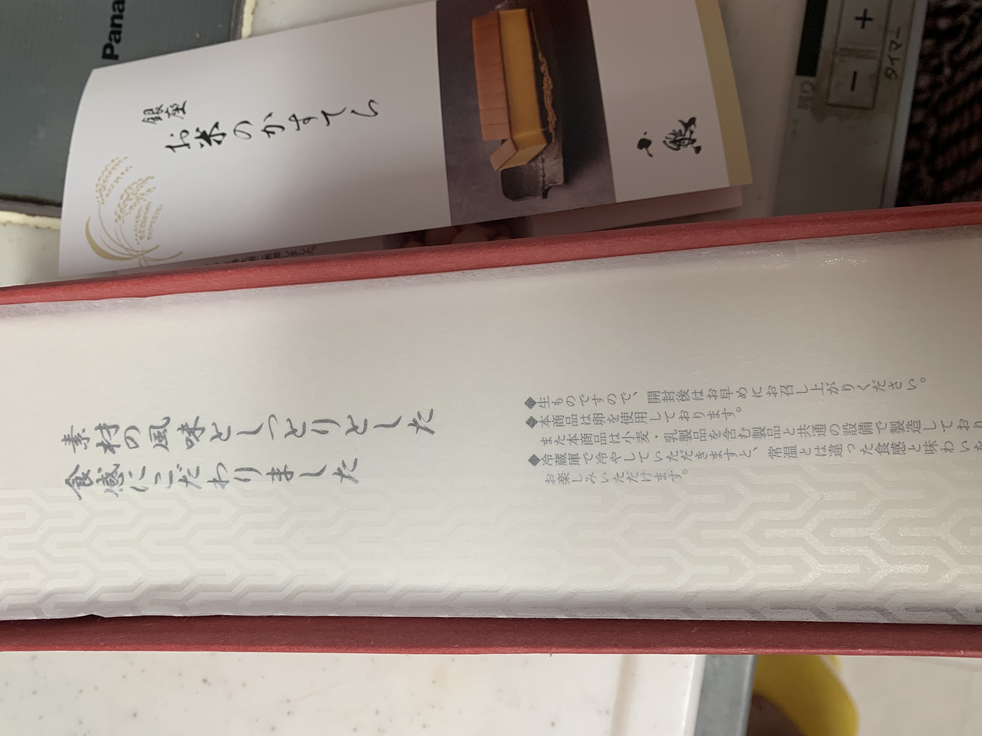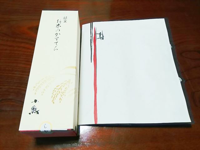 《卯の花色》と《紅色》をベースとしたお洒落な箱。角があり、引き出し型なので、つぶれる心配もない。同梱の手さげも落ち着きのあるデザイン。手土産にするのにもピッタリ!商品説明&商品紹介が書かれたリーフレットもついている。
