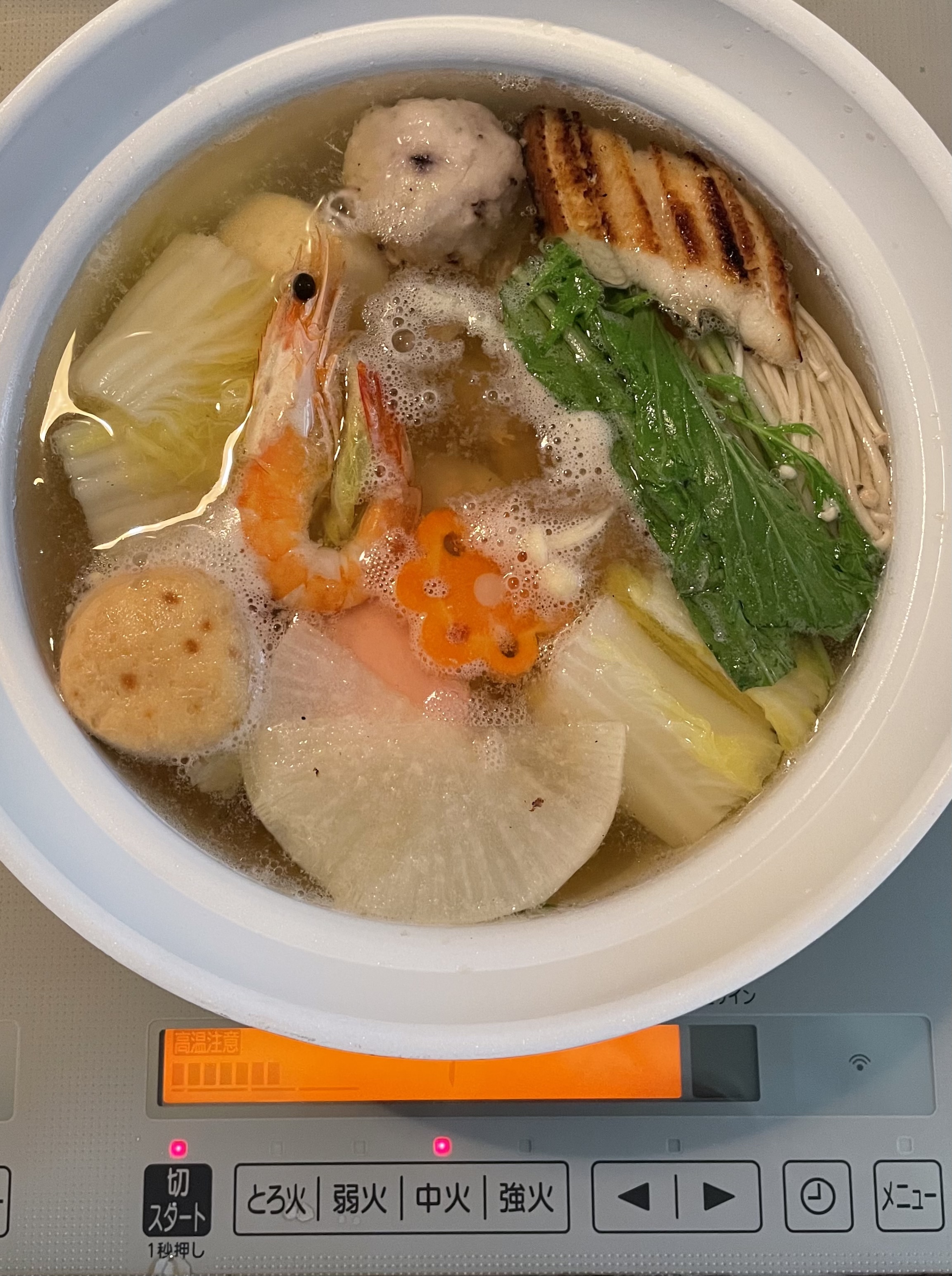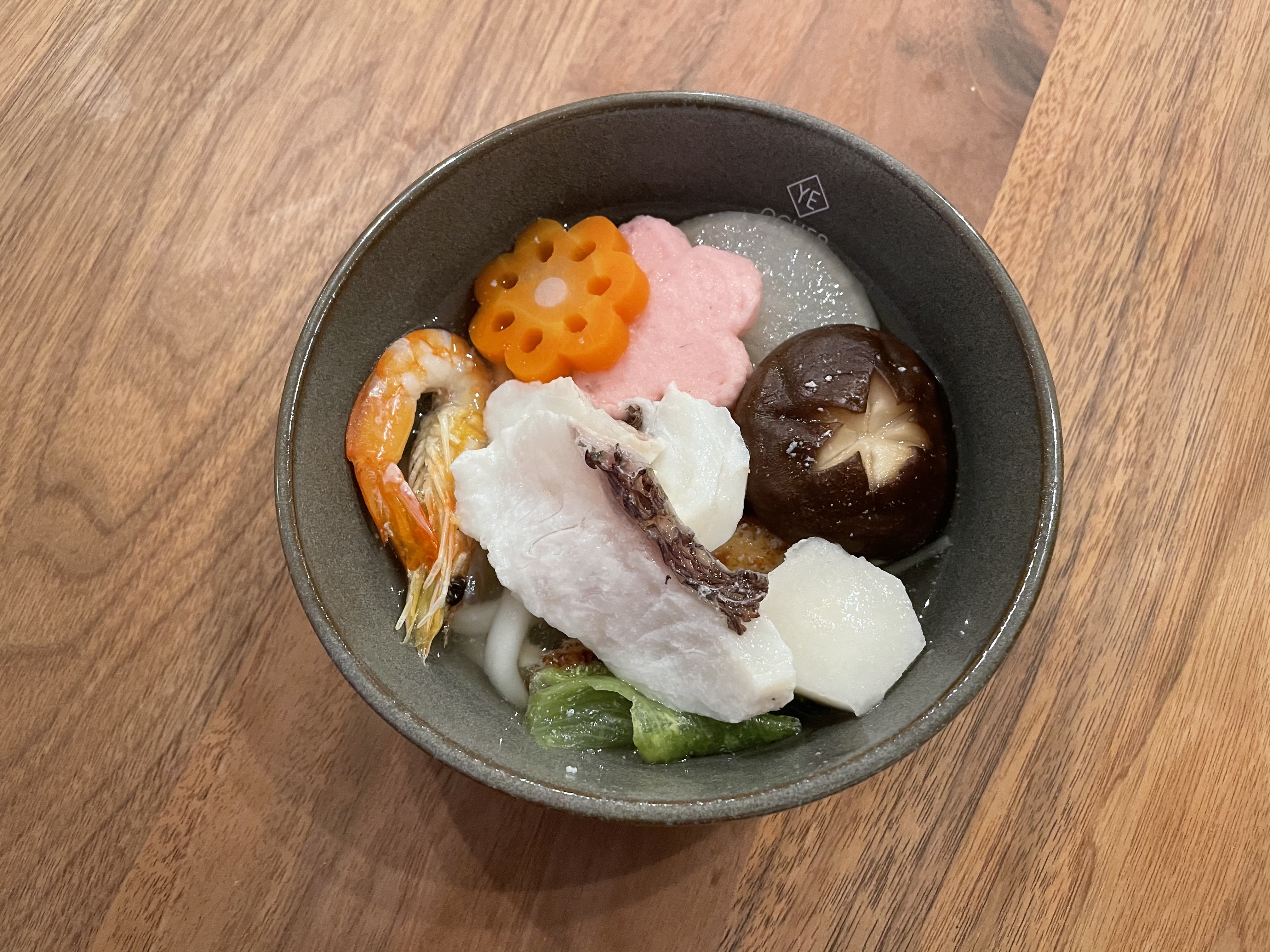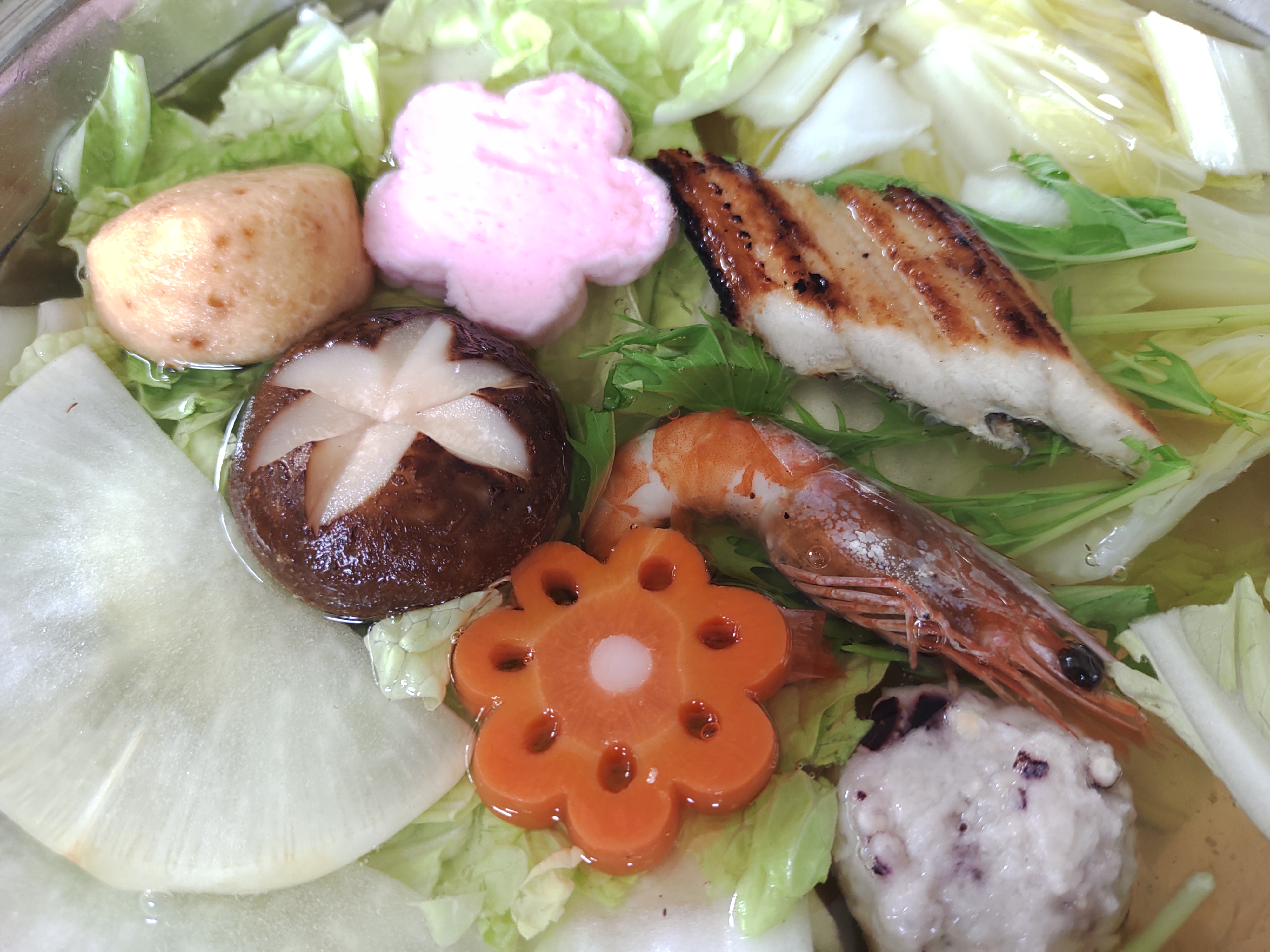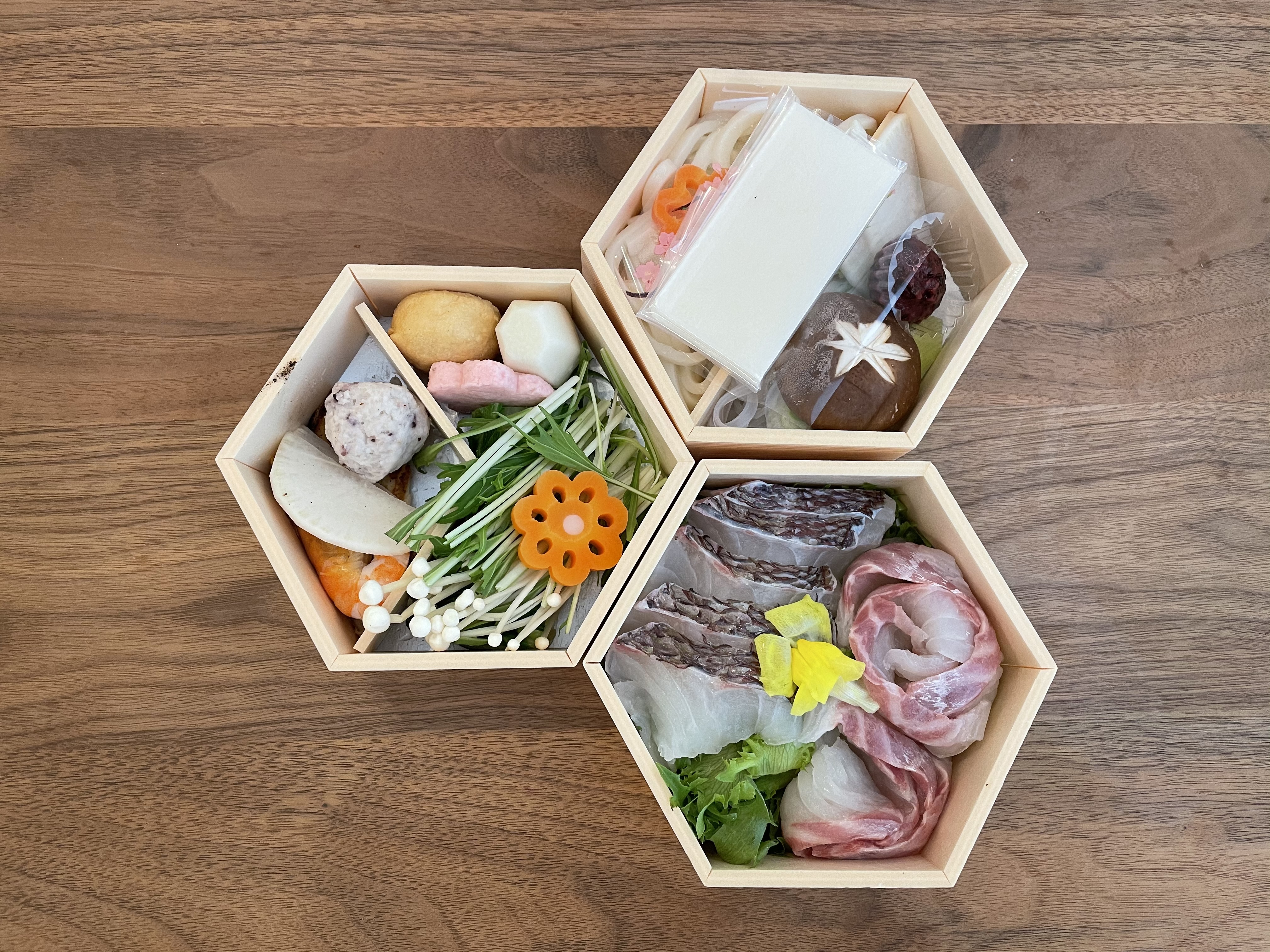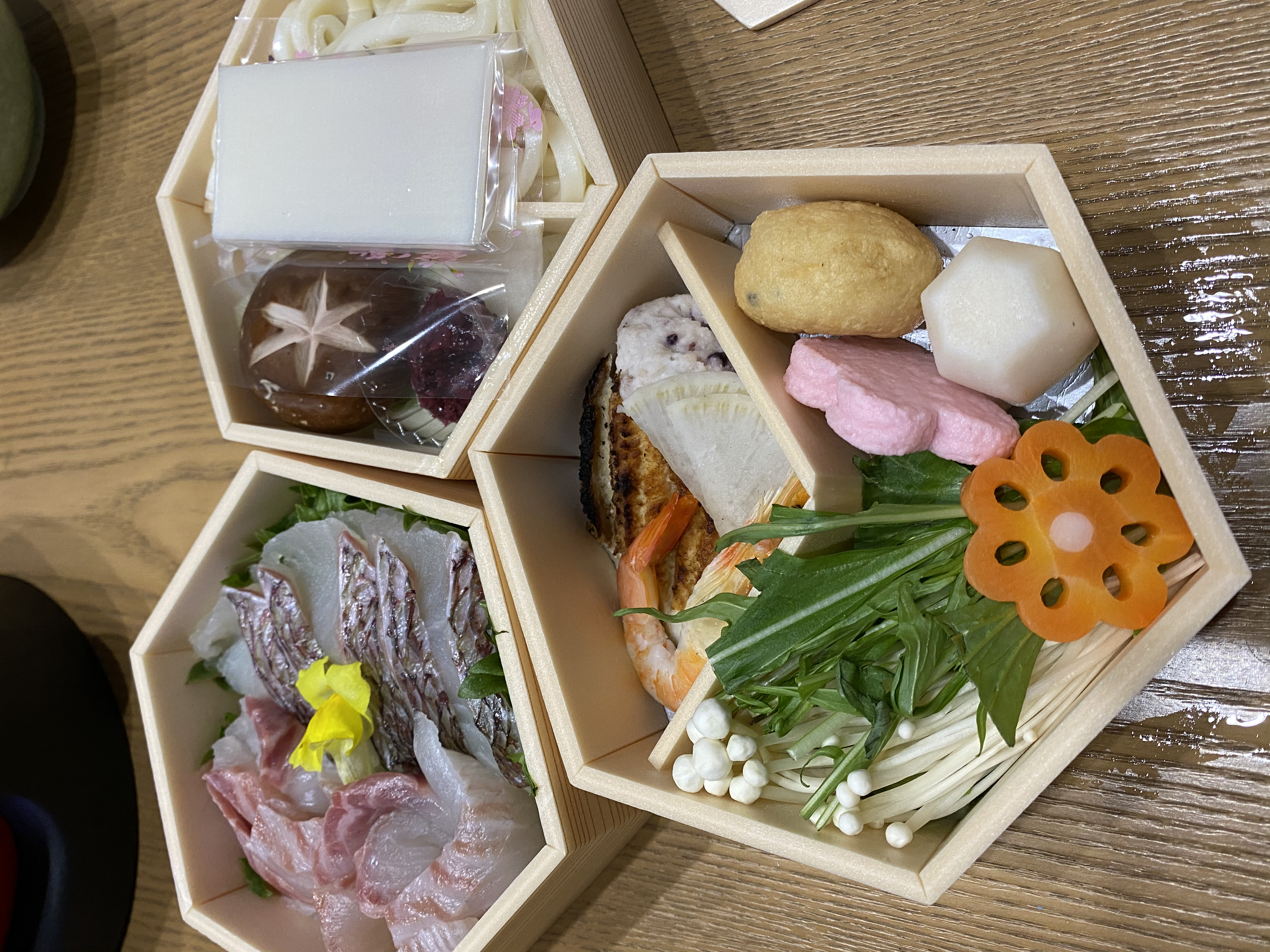 2段目はうどんやお餅、エビ、つみれ、がんもなどが、3段目は野菜がそれぞれ綺麗に敷き詰められていました。