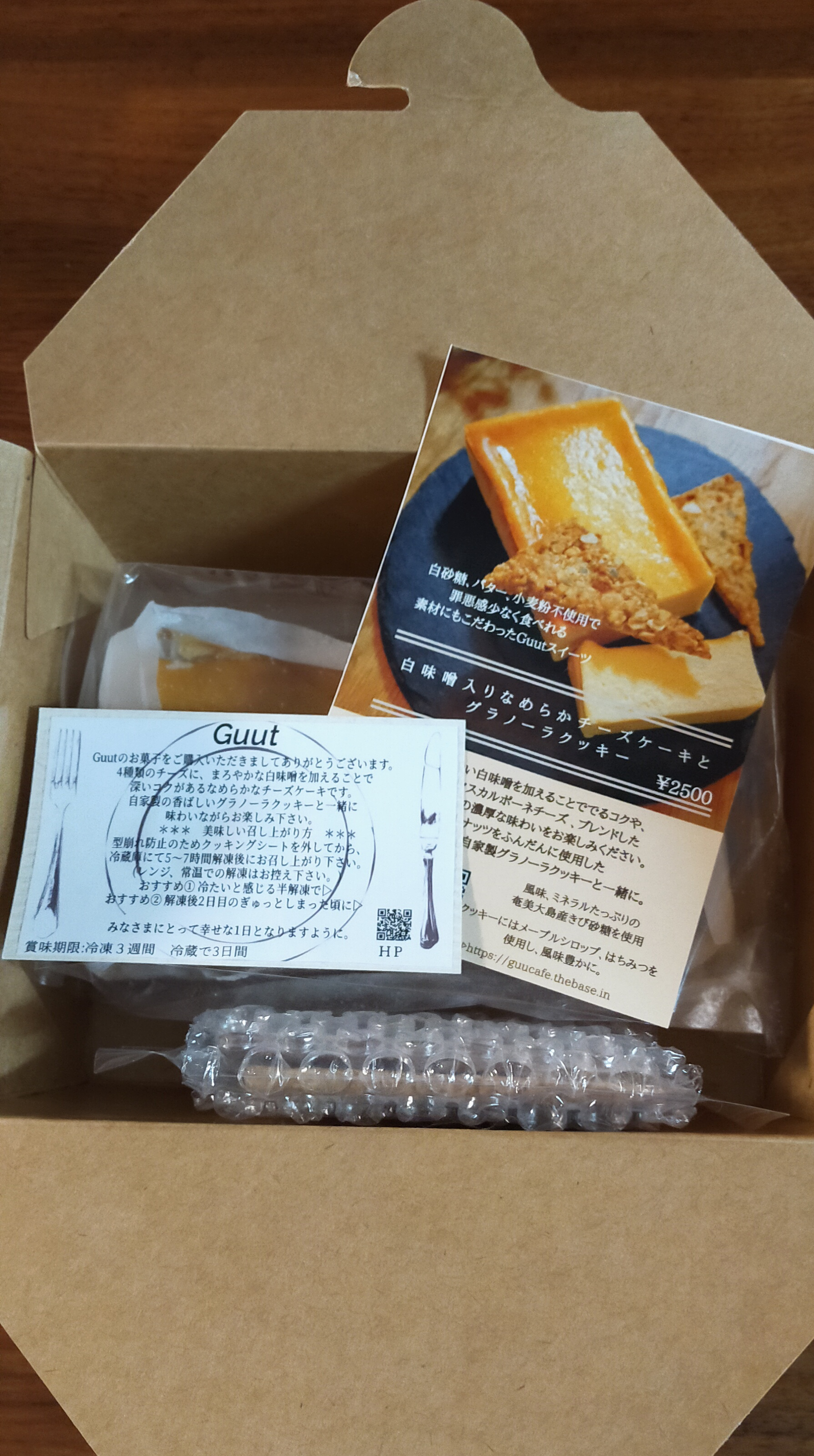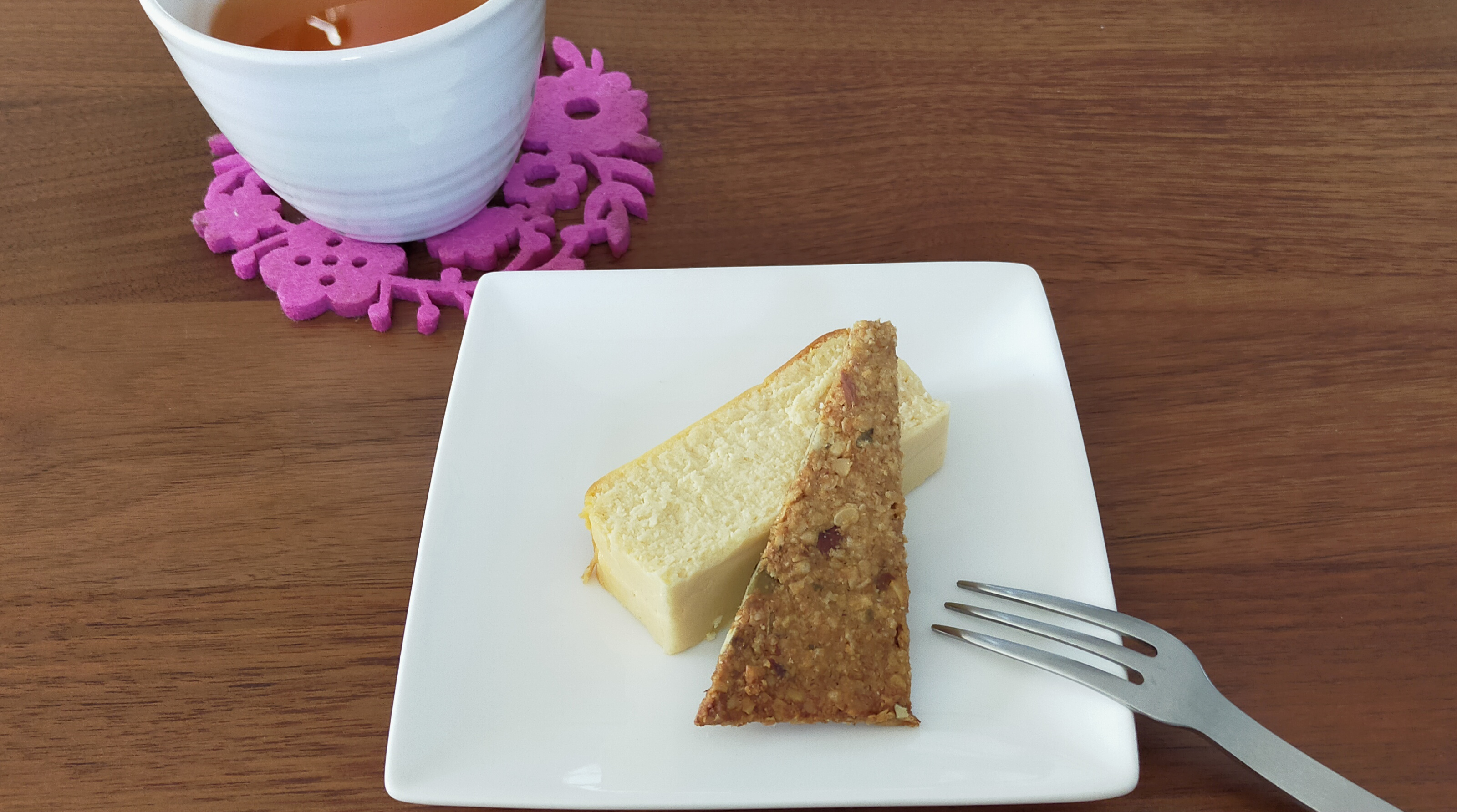 お家で実食した後、あまりの美味しさに、残りを職場にも持って行き皆んなで食べましたが、皆んな、こんな美味しいチーズケーキ初めてだし、食べただけで高級感が感じられると言っていました。こちらのチーズケーキは、甘さも控えめで、バターや白砂糖、小麦粉も使用されていないのも魅力的で、罪悪感なくこんな美味しいチーズケーキがいただけるなんて女性にとってはとても嬉しいお品だと思いました。職場の仲間も、その点も評価していました。そして、グラノーラクッキーも美味しかったようでこれだけでも注文したいと言っていました。
