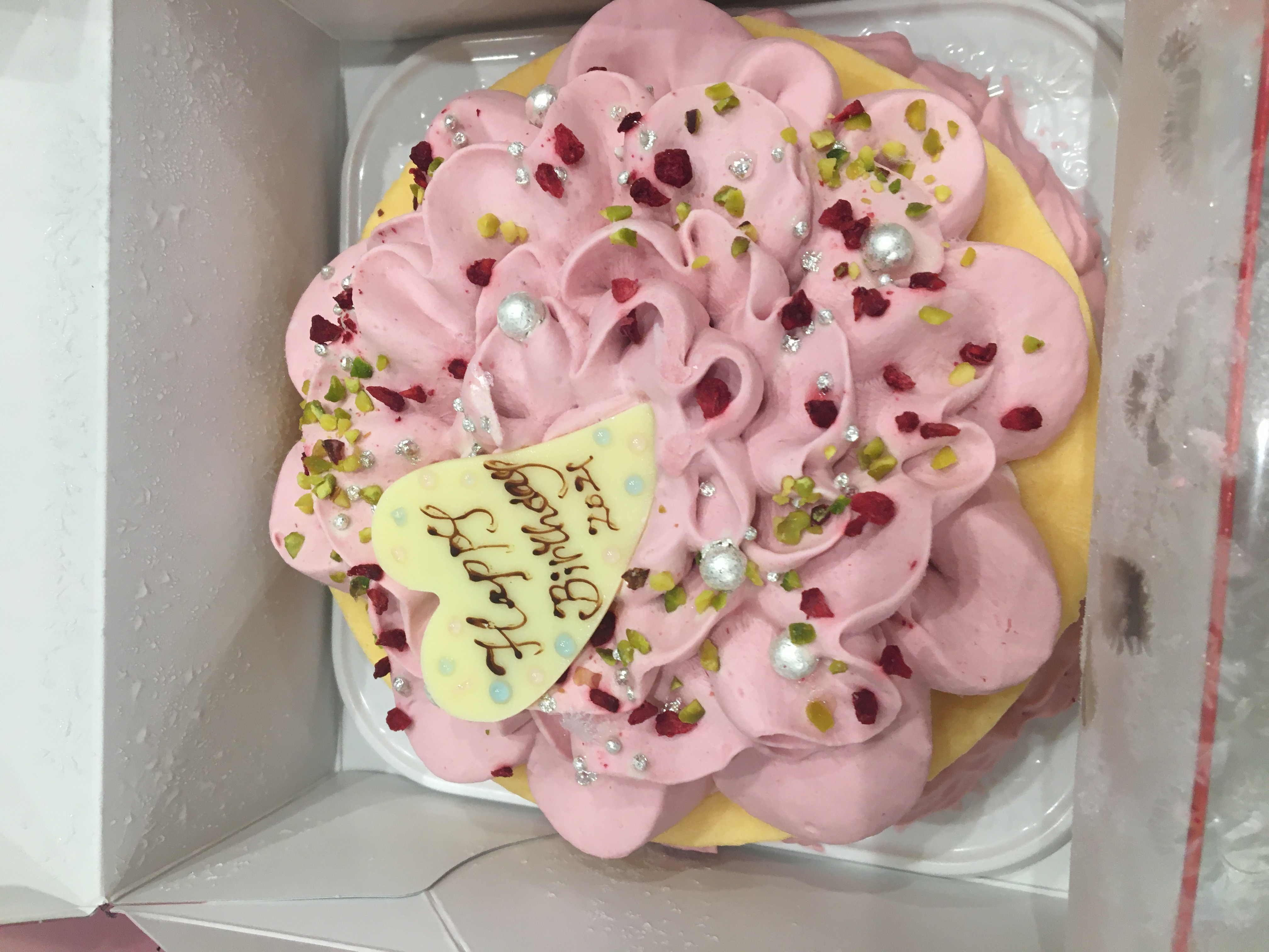 チーズケーキの上にはカーネーションの花びらのようなラズベリームースと彩りにピスタチオなどが散りばめられており、上品な華やかさがとても素敵でした。4号のケーキとなるとホールケーキとしては小さめのサイズですが、カーネーション部分のラズベリームース部分が高さがあるので比較的大きく感じました。大人でも6分の1くらいのサイズで満足できると思うので2-4人で分けるのには十分かなと思います。