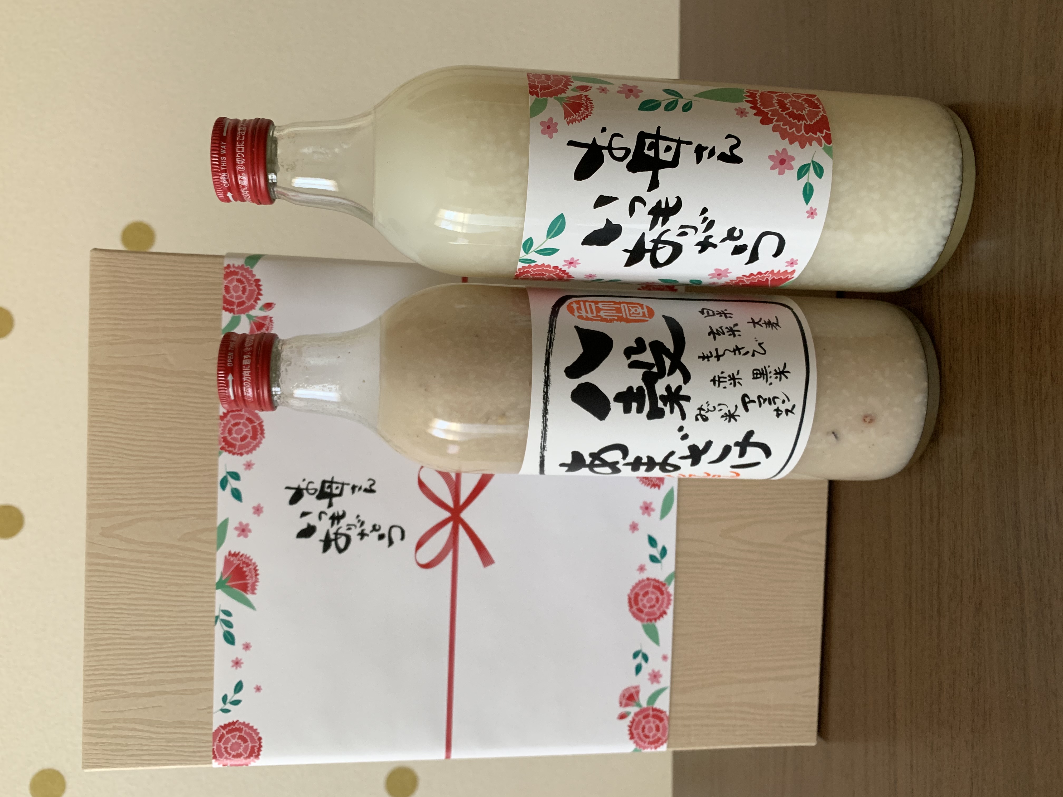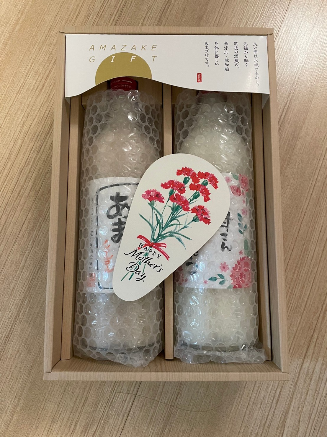 「白あまざけ」にはお花のイラストと共に「おかあさんいつもありがとう」の文字入り。