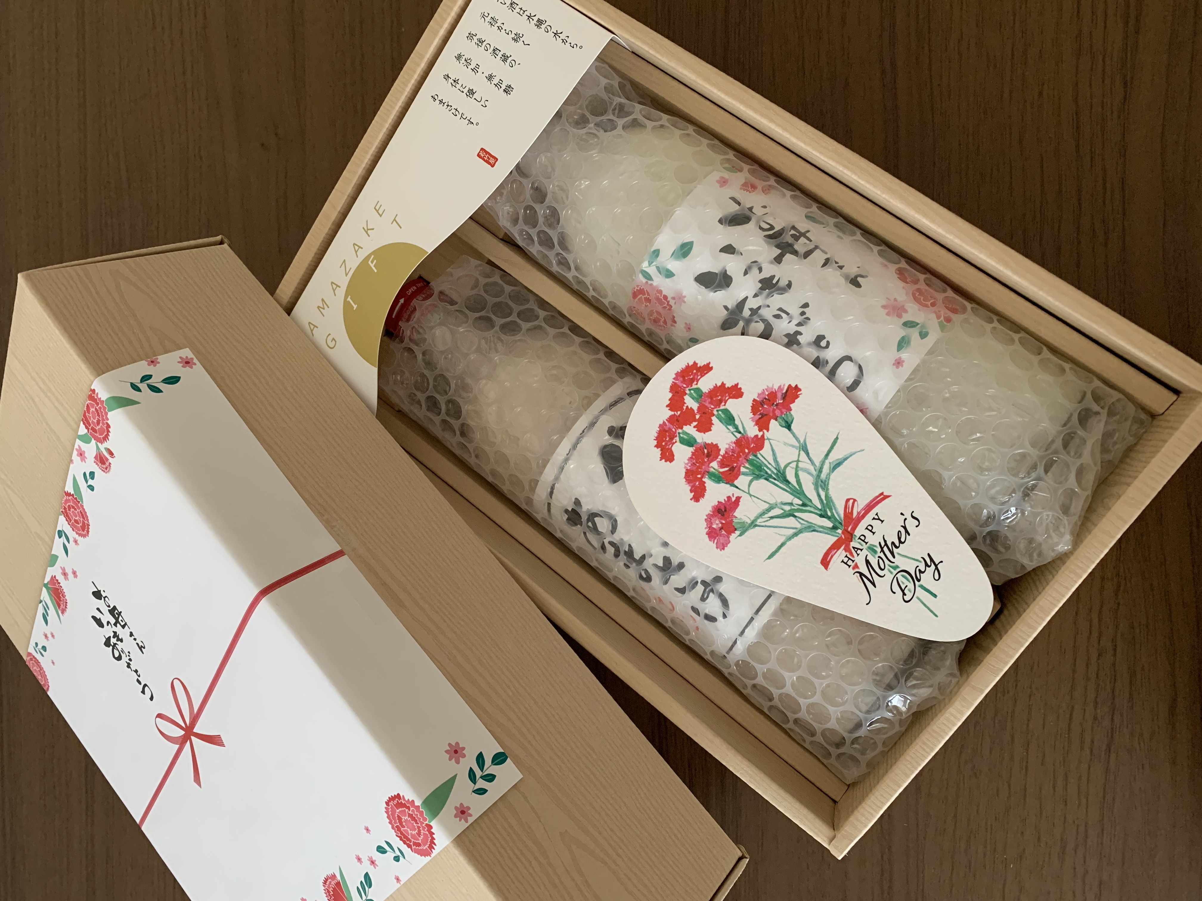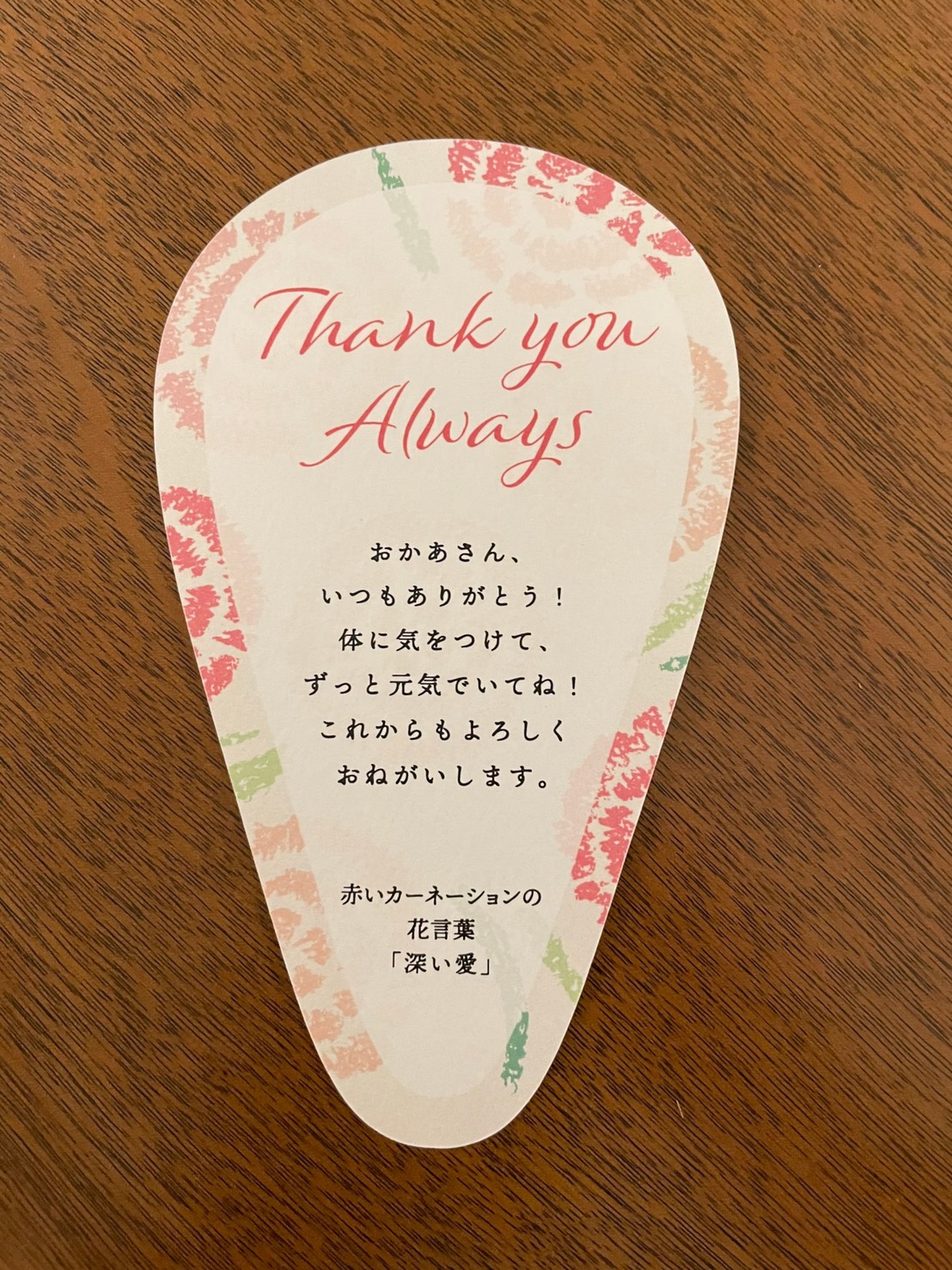 甘酒の上にはカーネーションが描かれたかわいらしいメッセージカード付き!裏には「おかあさんいつもありがとう!体に気を付けてずっと元気でいてね。これからもよろしくおねがいします」という心温まる母へのメッセージと赤いカーネーションの花言葉「深い愛」が書かれていて、これを母に渡したらきっと喜ぶだろうな♪とうれしくなりました。ちょっとした心遣いがありがたいです。メッセージは色々選べるそうなので、気に入ったメッセージを添えるとより一層気持ちが伝わりますよね。