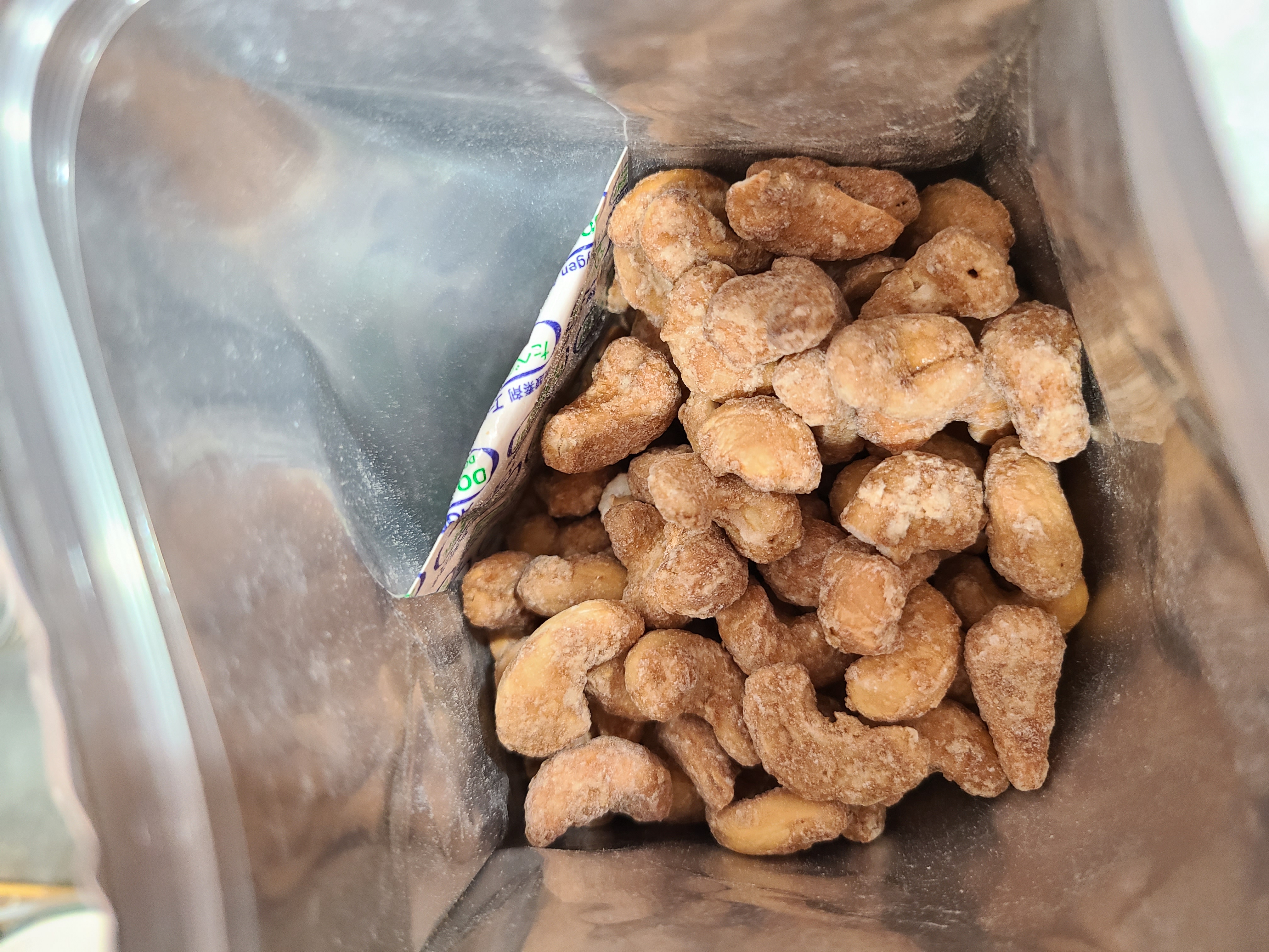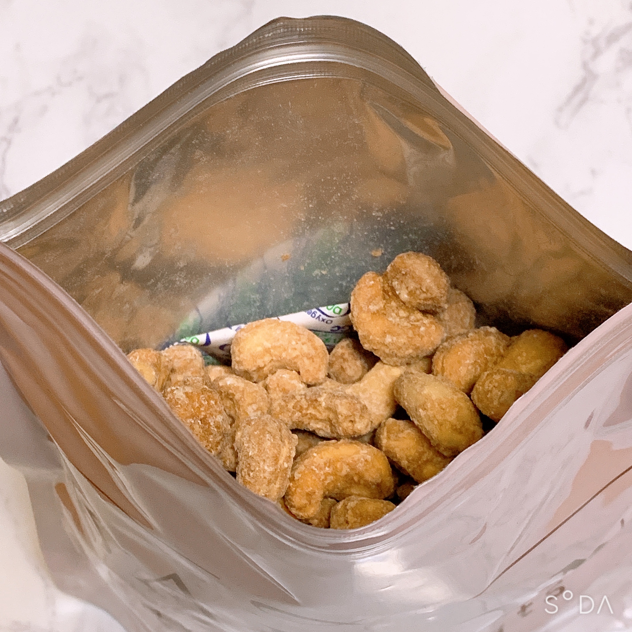 とにかくボリューミーです!!そして封を開けたらメープルの香りがふんわり広がり、とても美味しそうな香りがします。取り出してみると、そのつぶの大きさにも驚きました!!ゴロゴロと大きなカシューナッツが入っています!周りはメープルでコーティングされていて、ひと口食べるとカリカリコリコリ食感で、噛みごたえ抜群!!