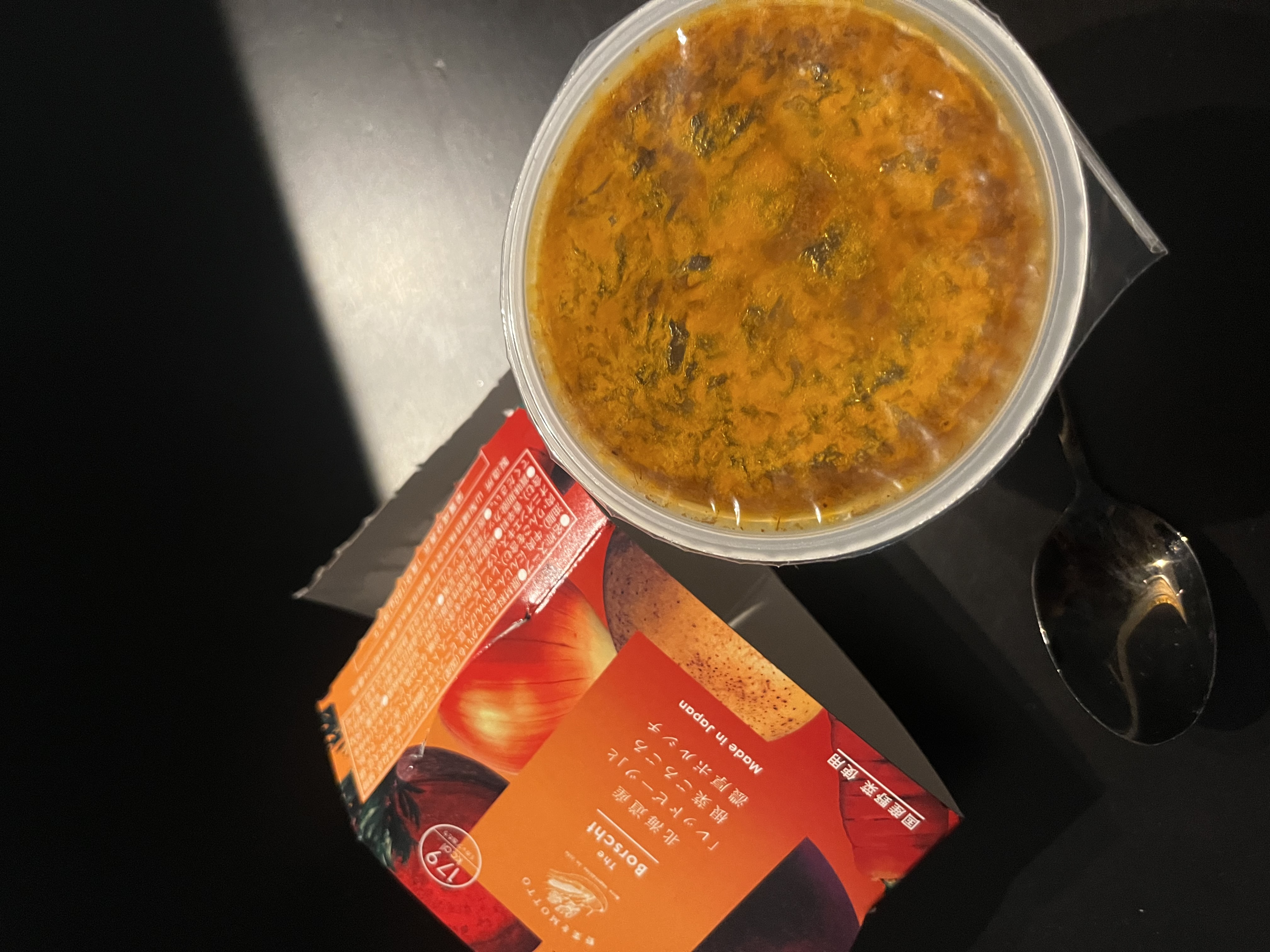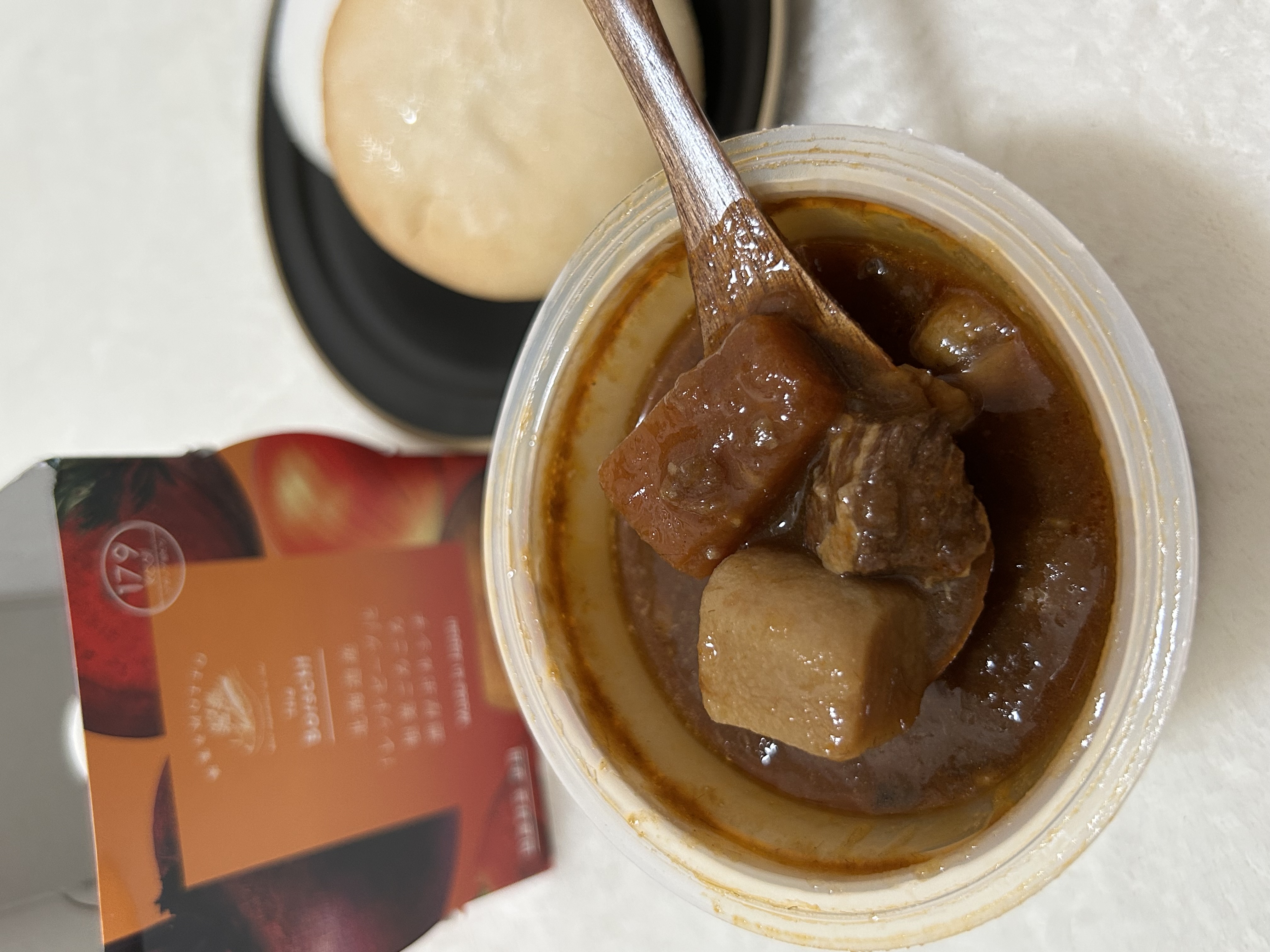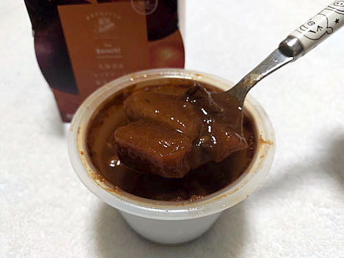 『北海道産レッドビーツと根菜ごろごろ濃厚ボルシチ』は北海道産のレッドビーツを使用していて、牛肉、じゃがいも、にんじん、白インゲン豆がゴロゴロ入った具沢山スープ。フランスパンに合わせて食べました。