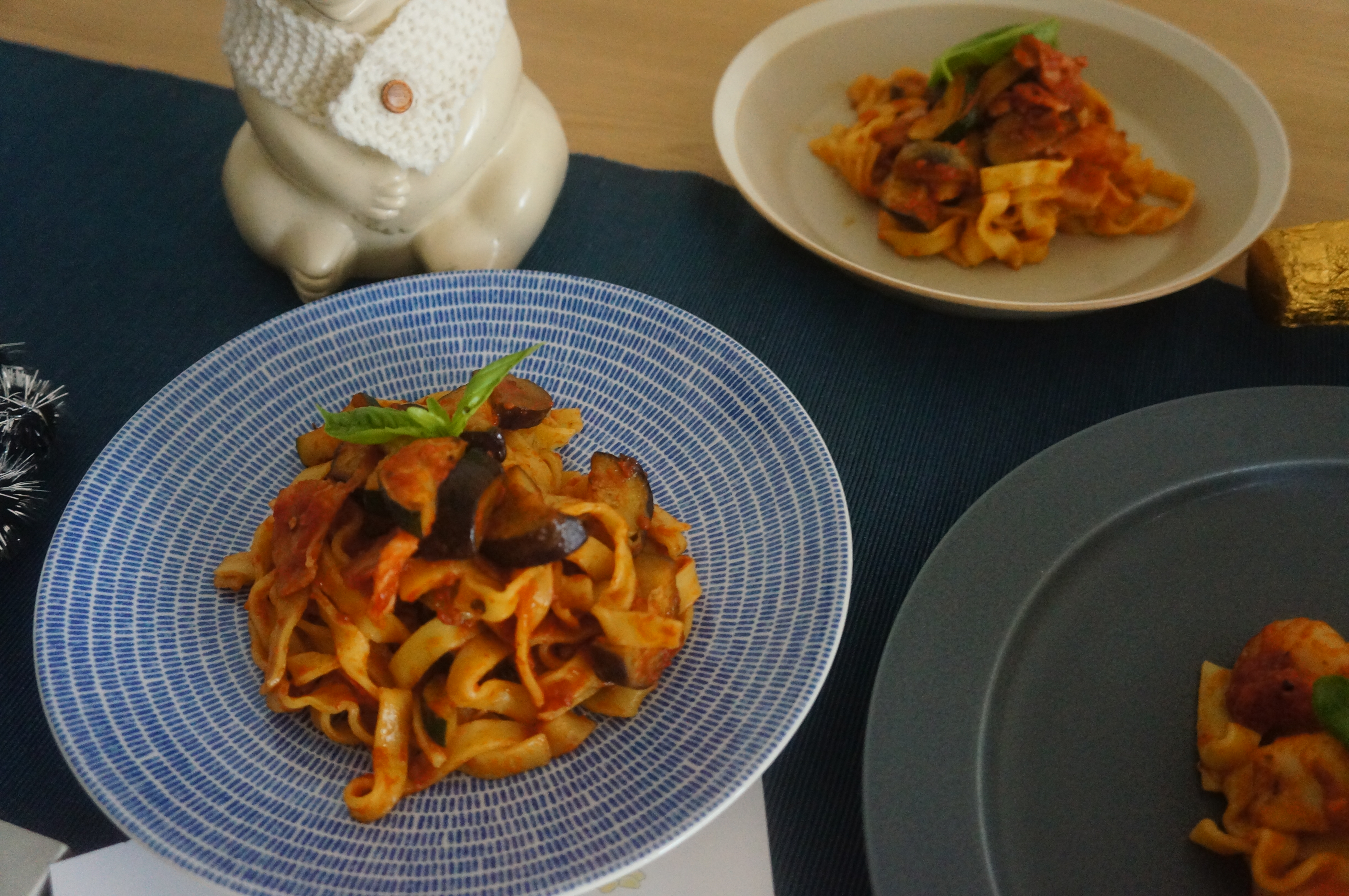 そして鮮やかな赤褐色がとても綺麗。具材として、ナスとプチトマトを追加し、最後にパセリを振りかけましたが、ソースの色合いが良く、とっても映えるパスタになりました。