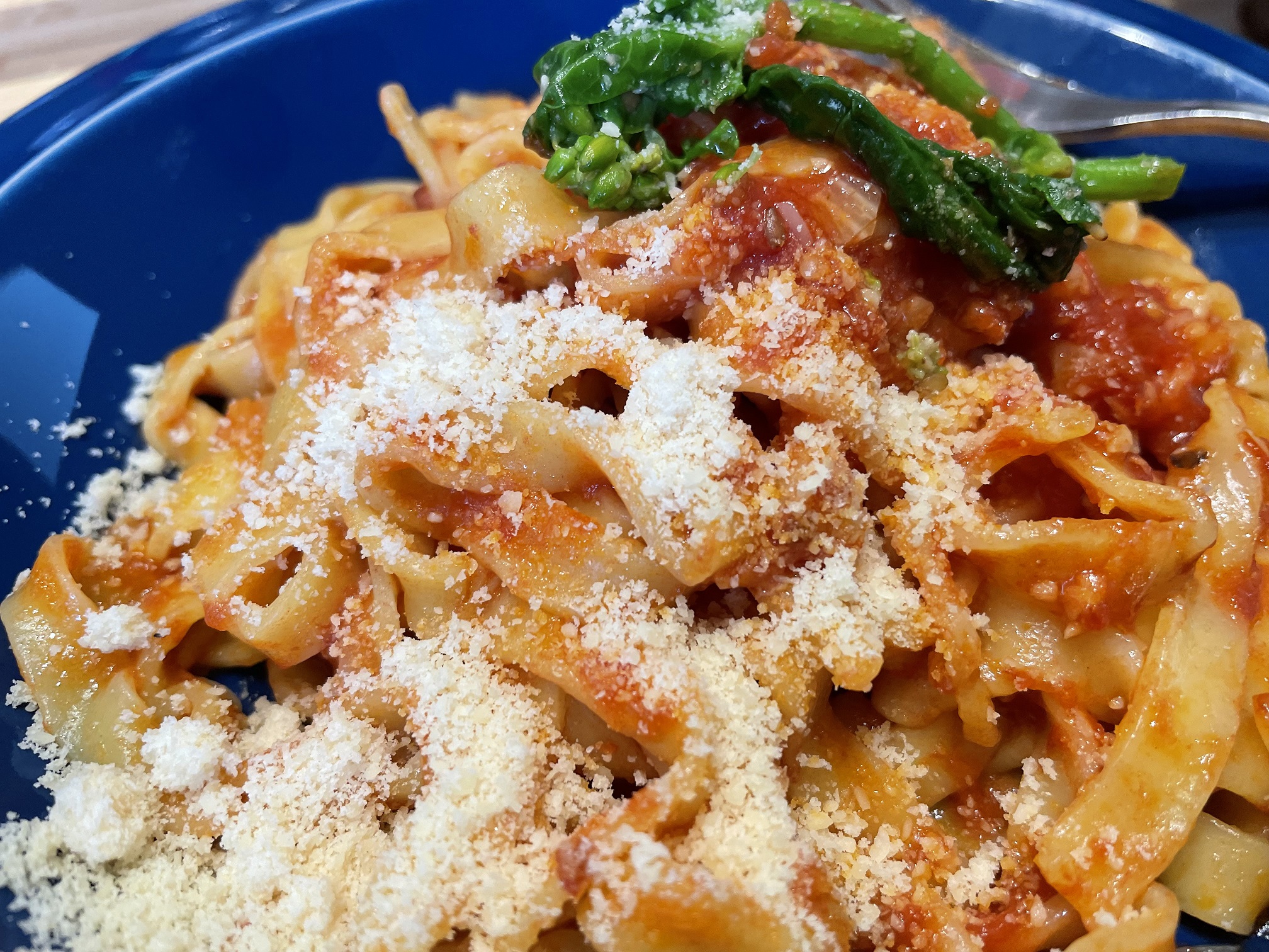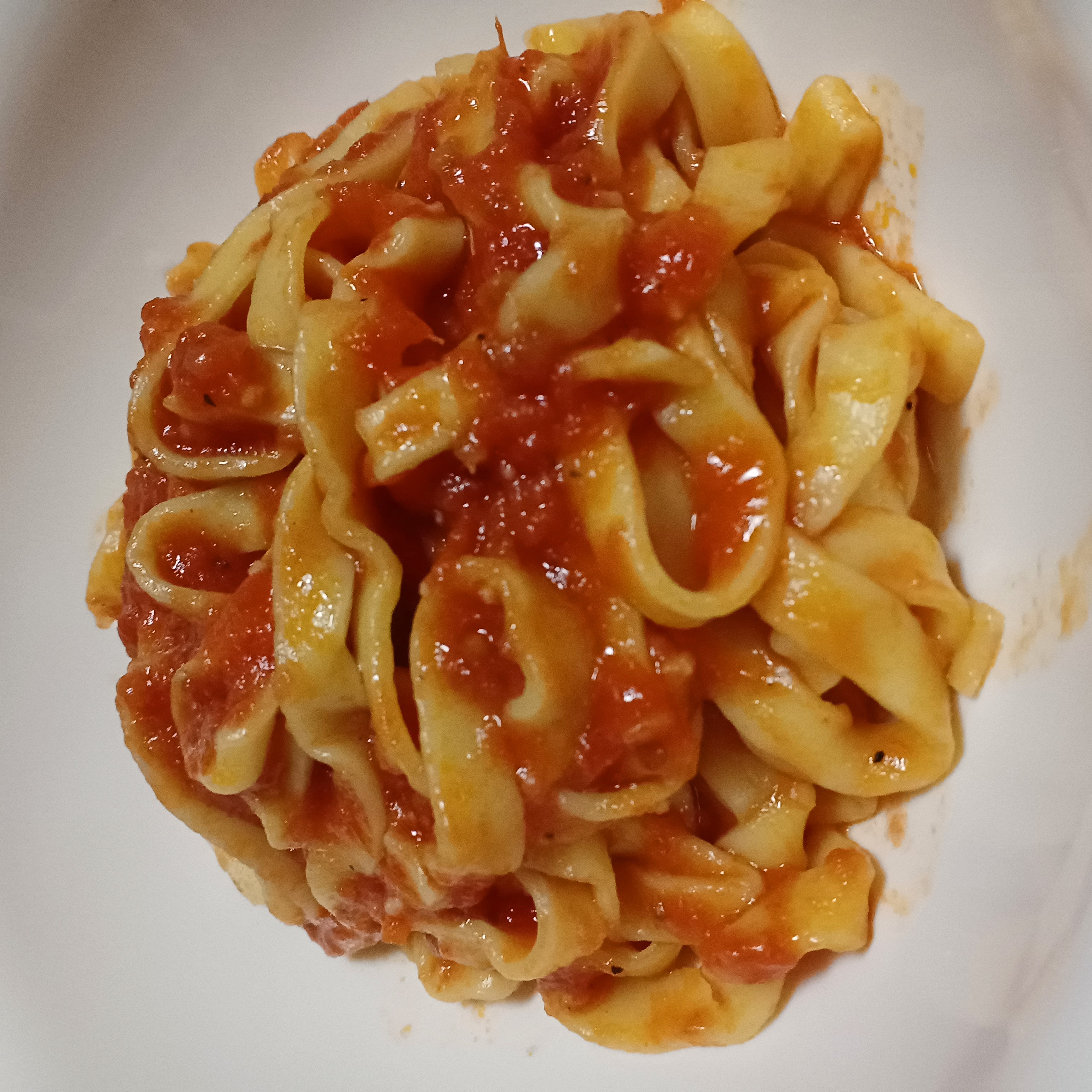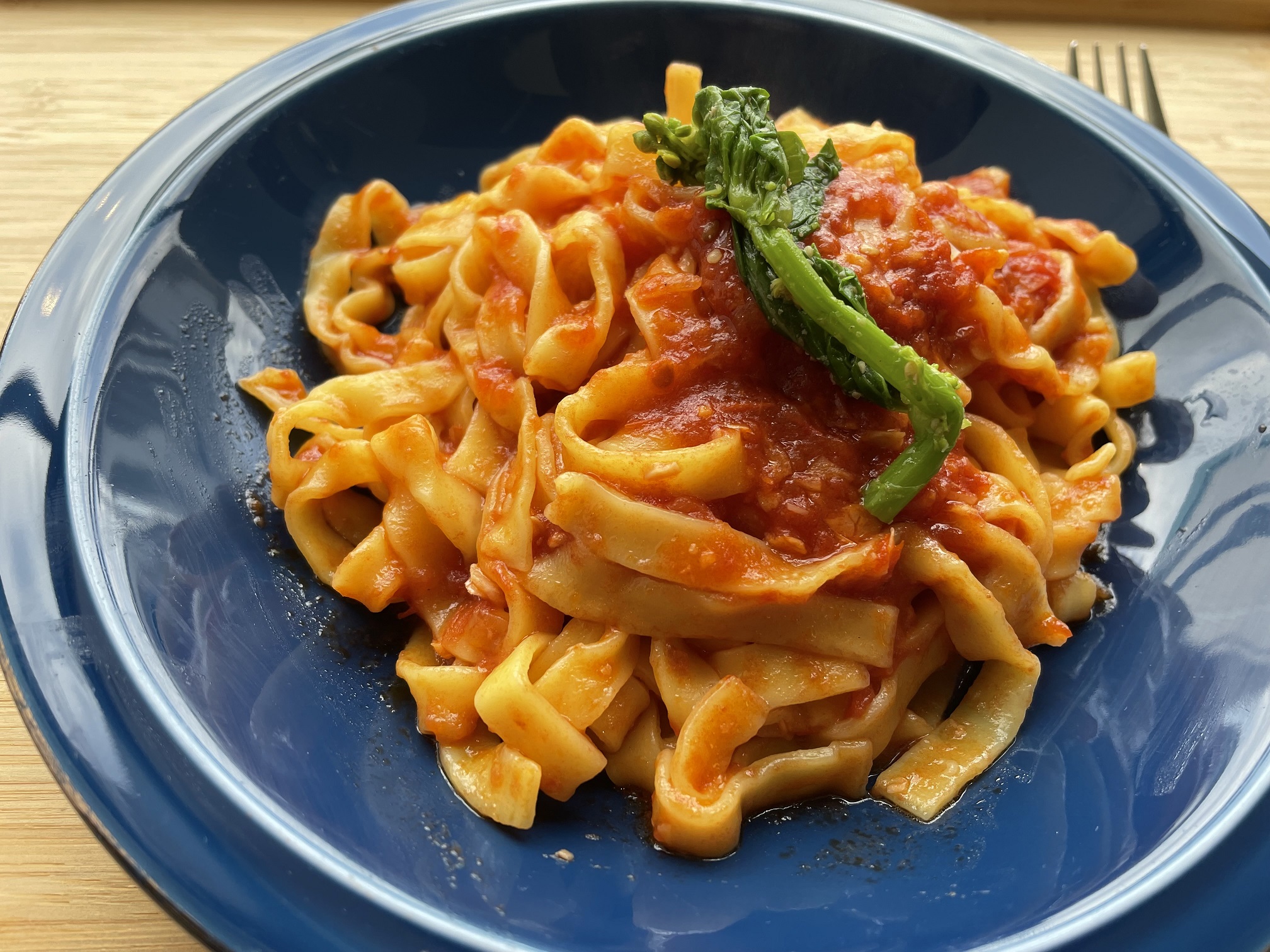 波打ってる形状なので、トマトソースとの絡みが良く、パスタを口に入れる度にソースがしっかり付いてきます。まさにこれが『ソースを引き立たせている』という事なのでしょうか^^