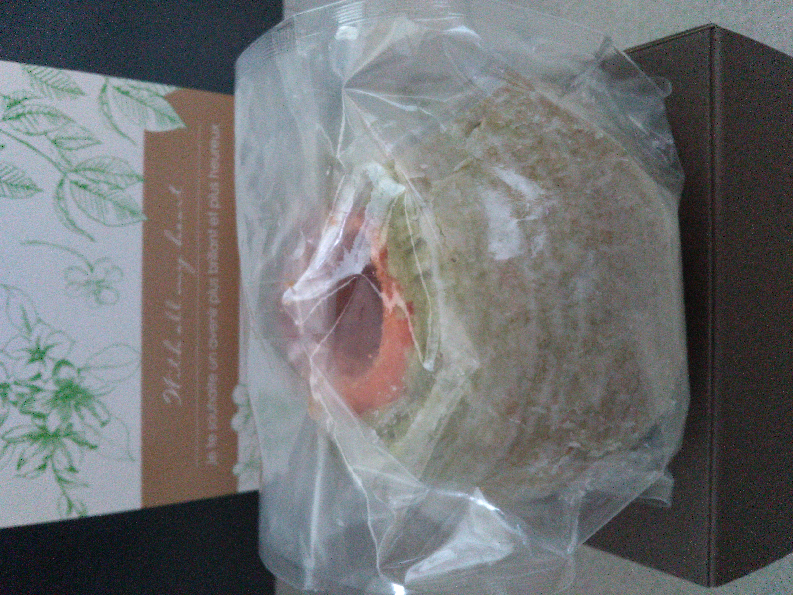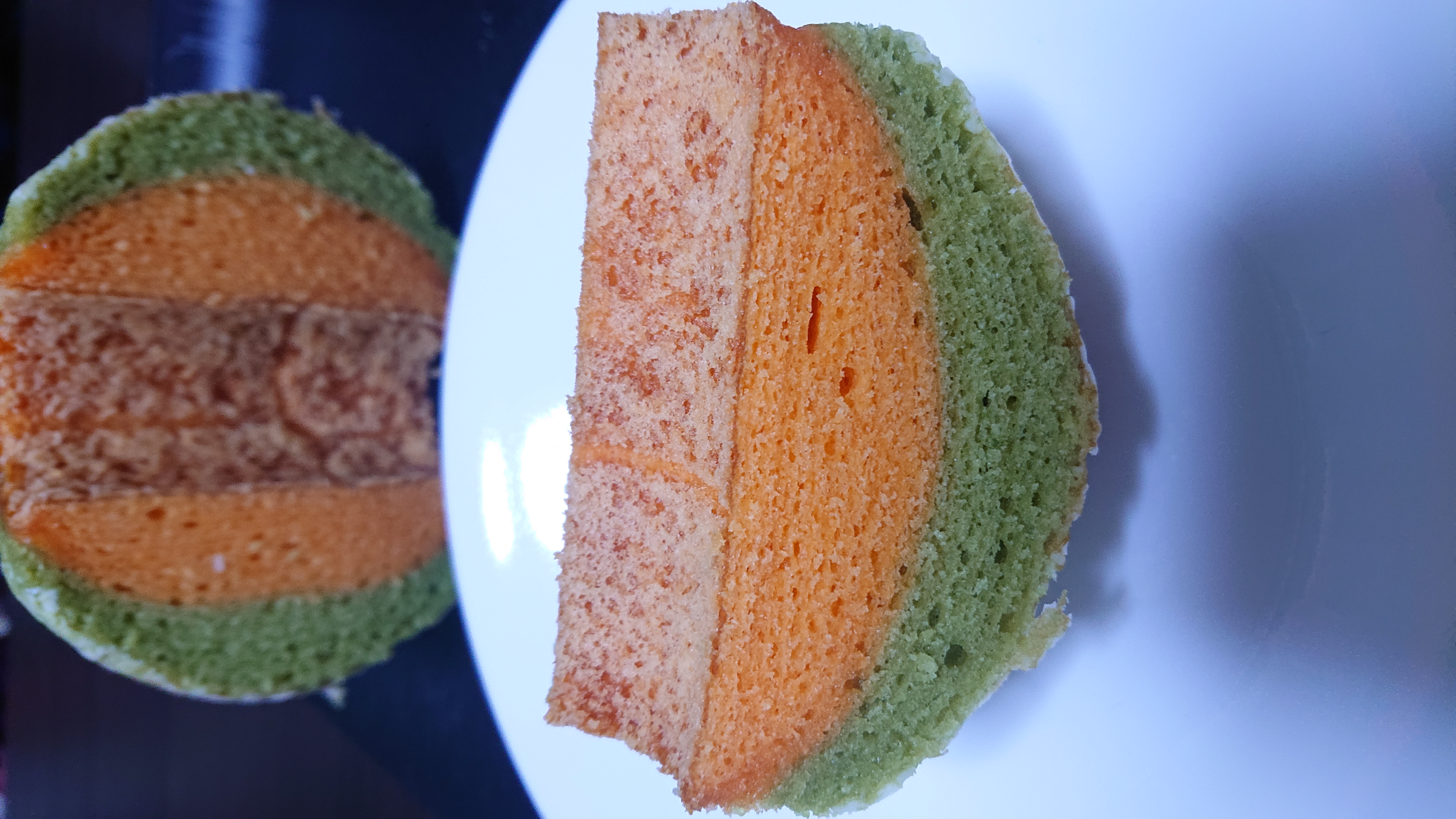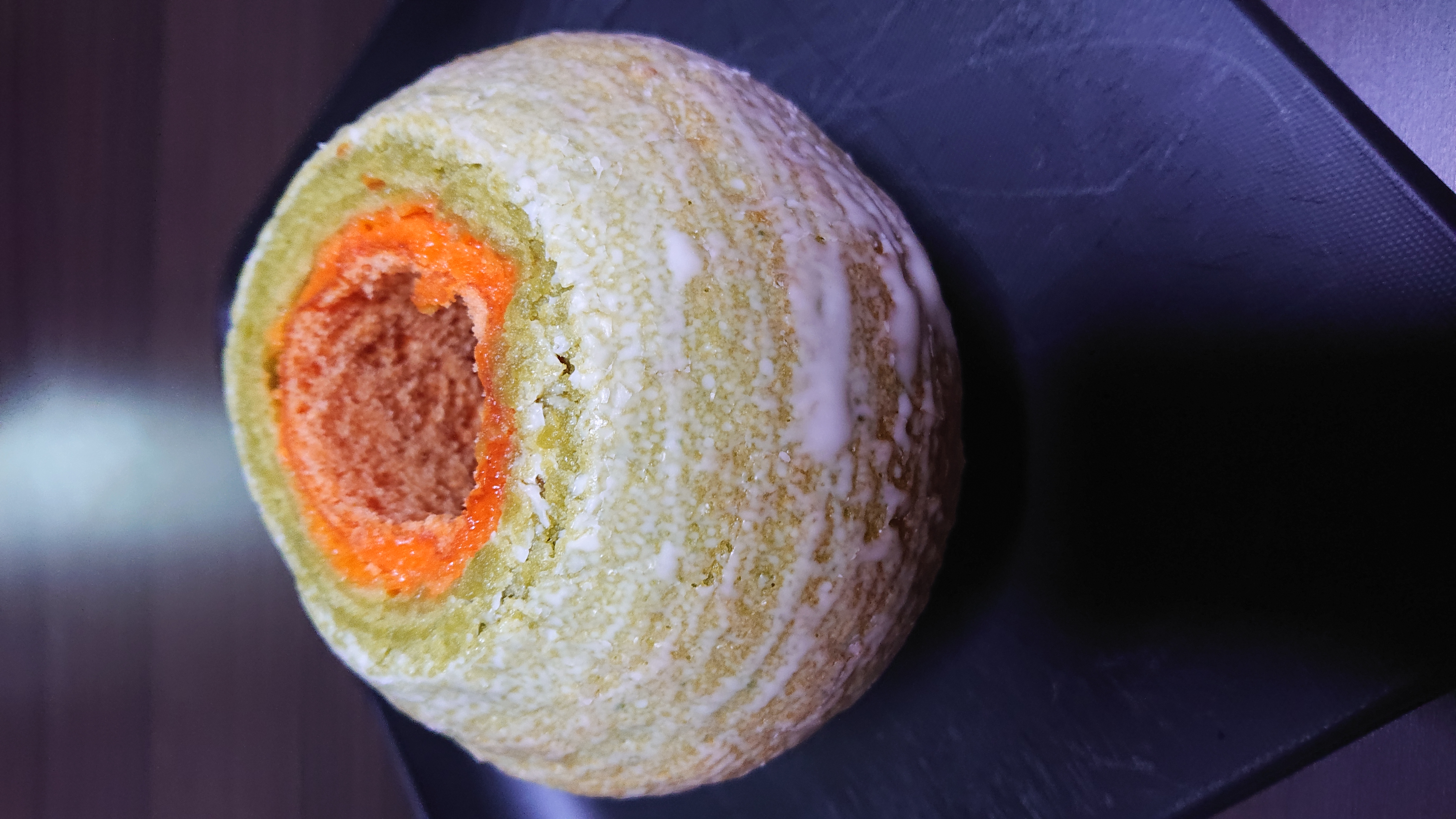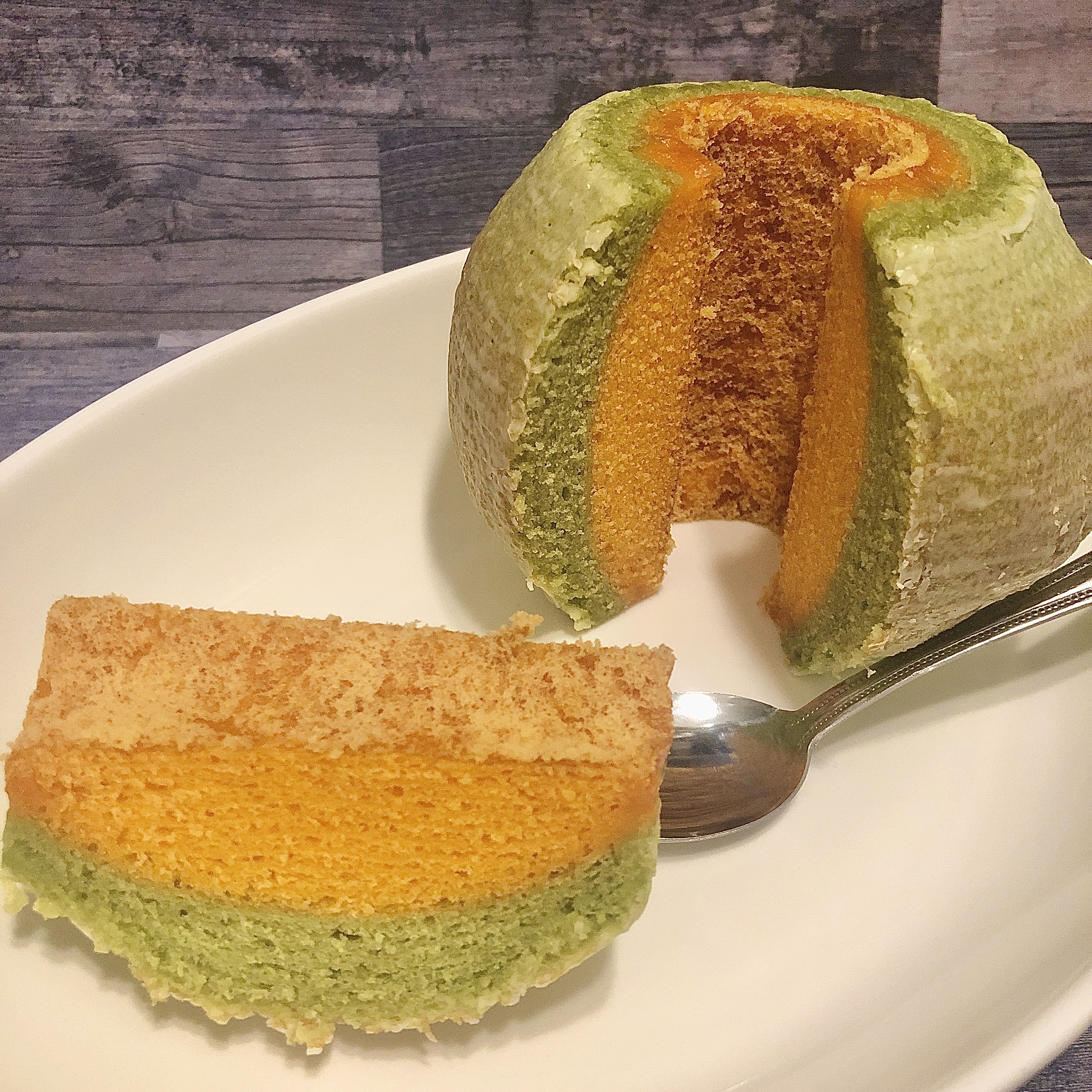 切ってみるとバウムクーヘンならではの層に綺麗な2色のメロンカラー。