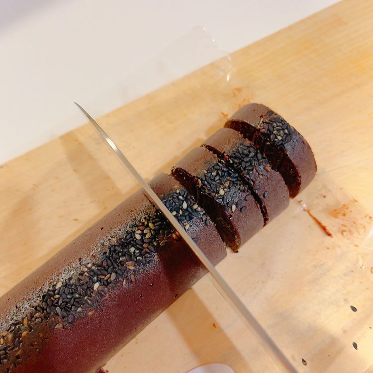 美味しい食べ方の紙の通りにしてカットし黒ごまきなこをかけます!!