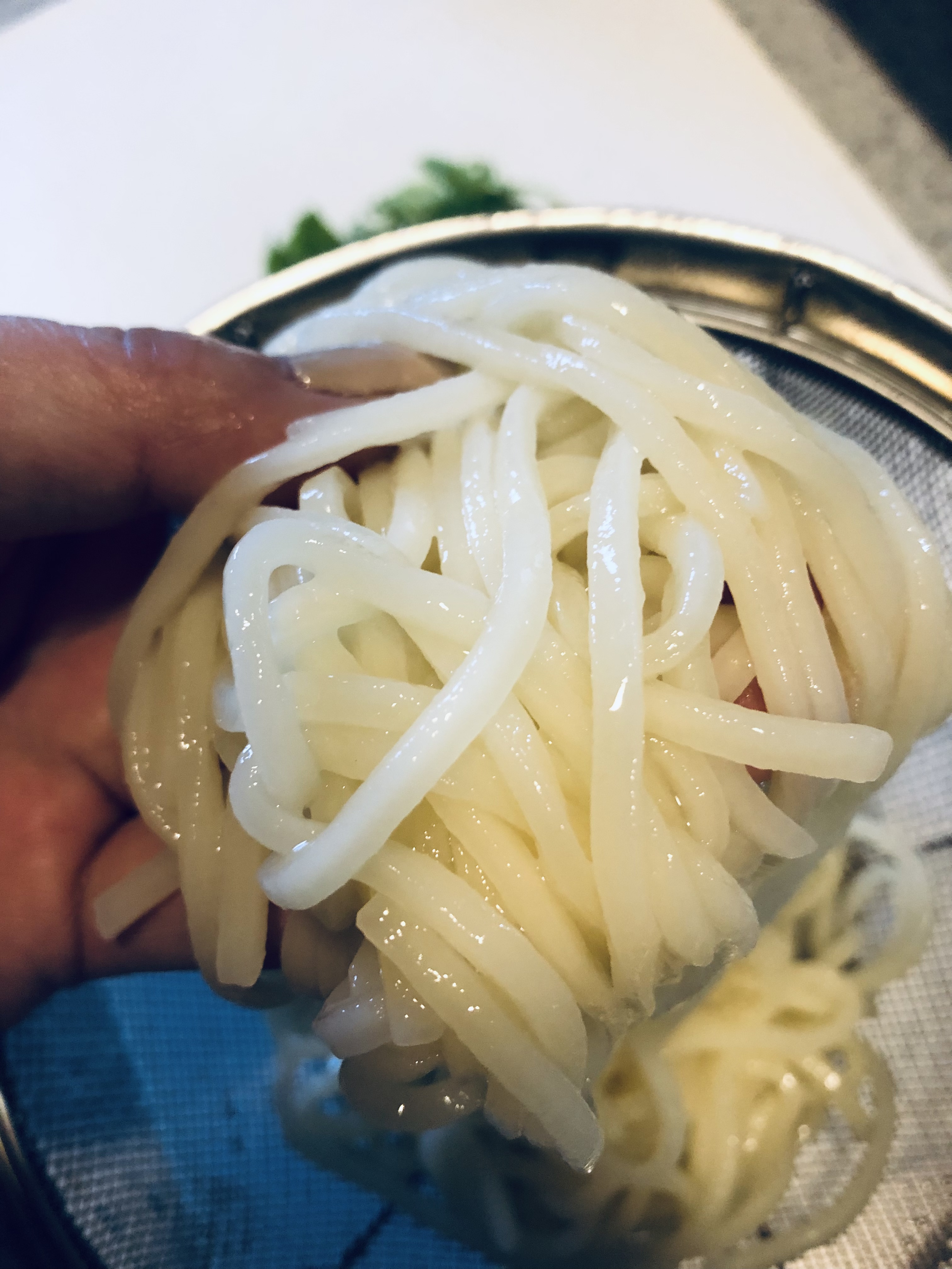 茹でるときに、麺と麺がくっつかないように、しっかりほぐしてね。そのほうが美味しい。
