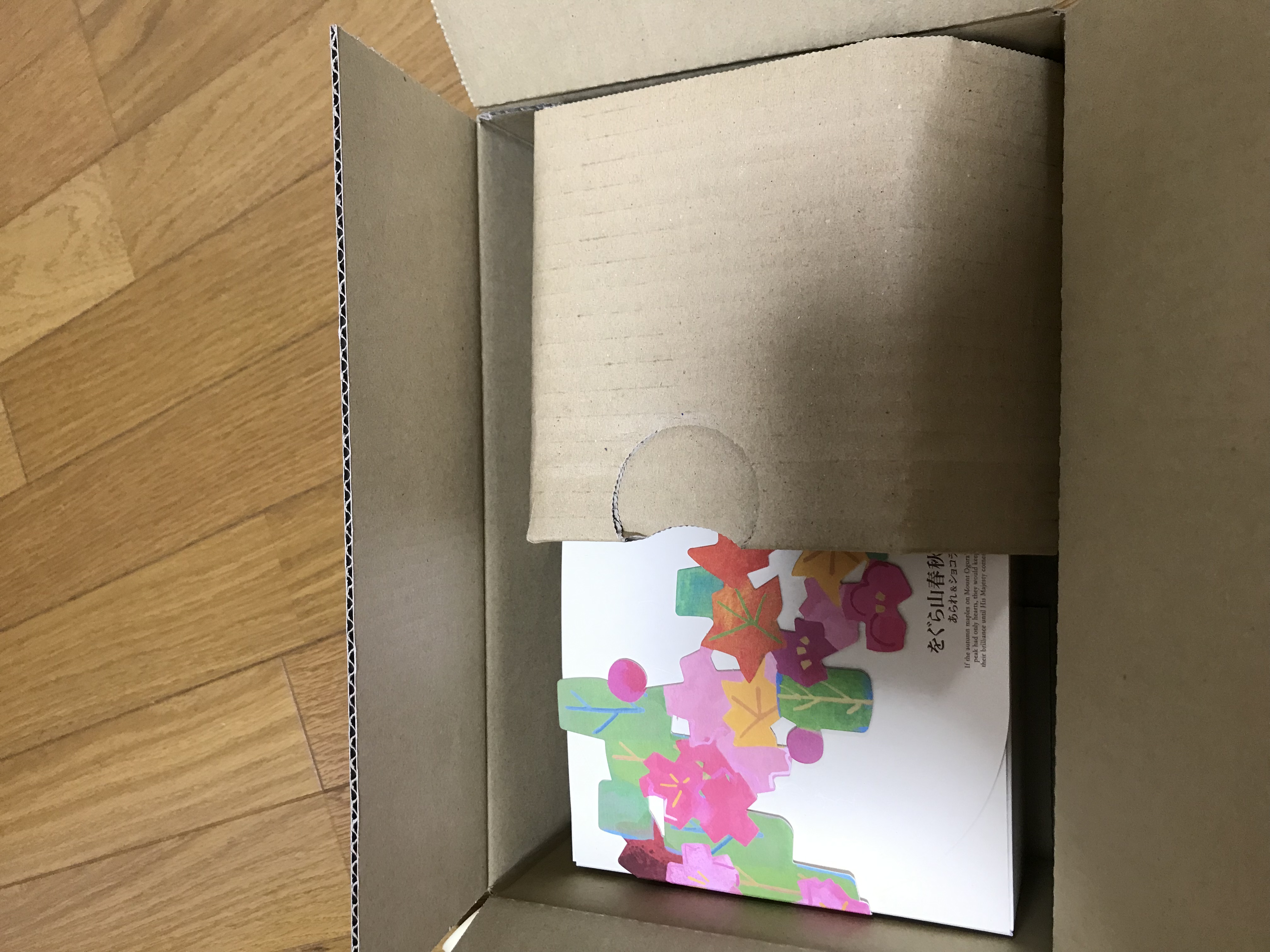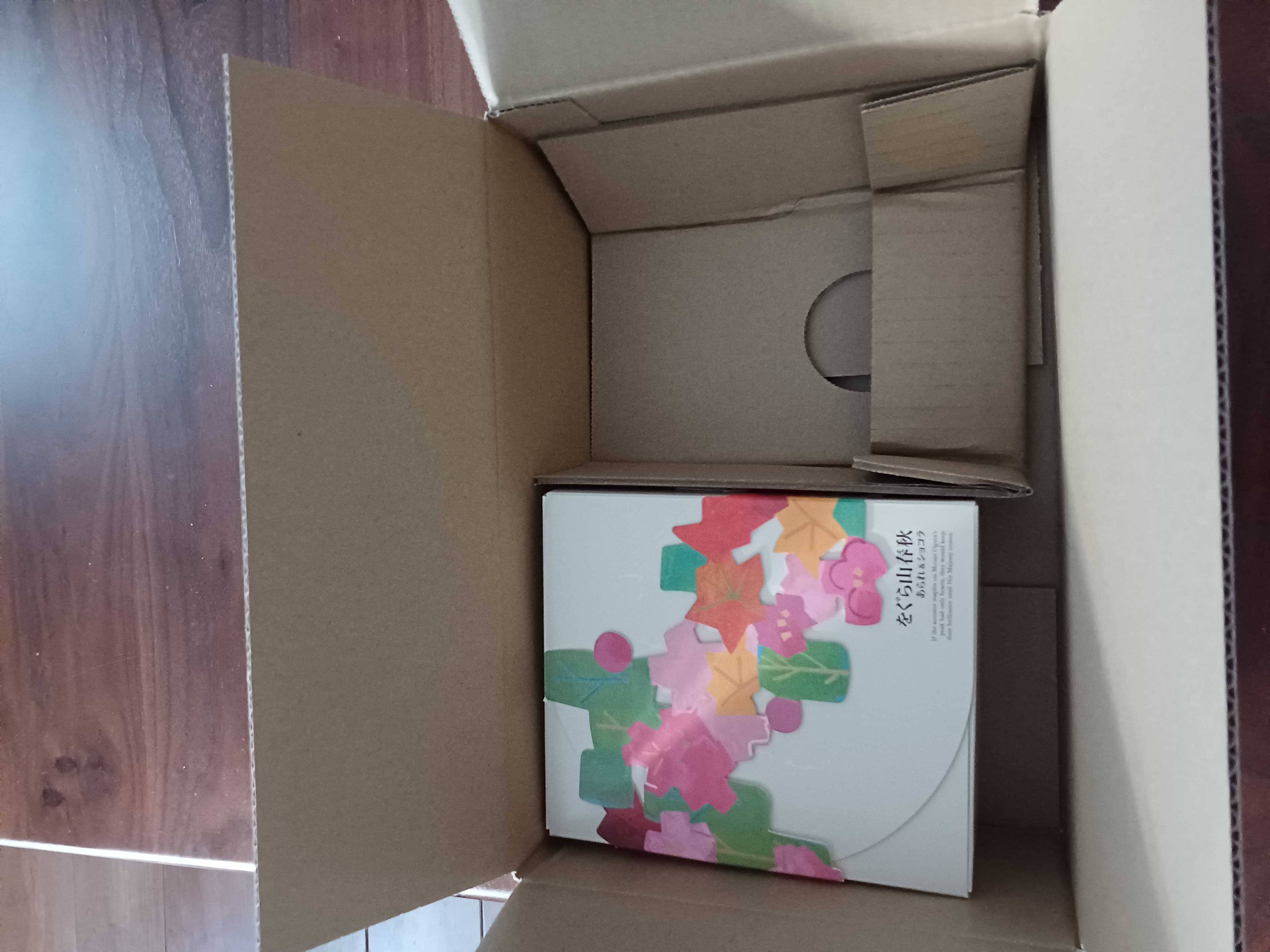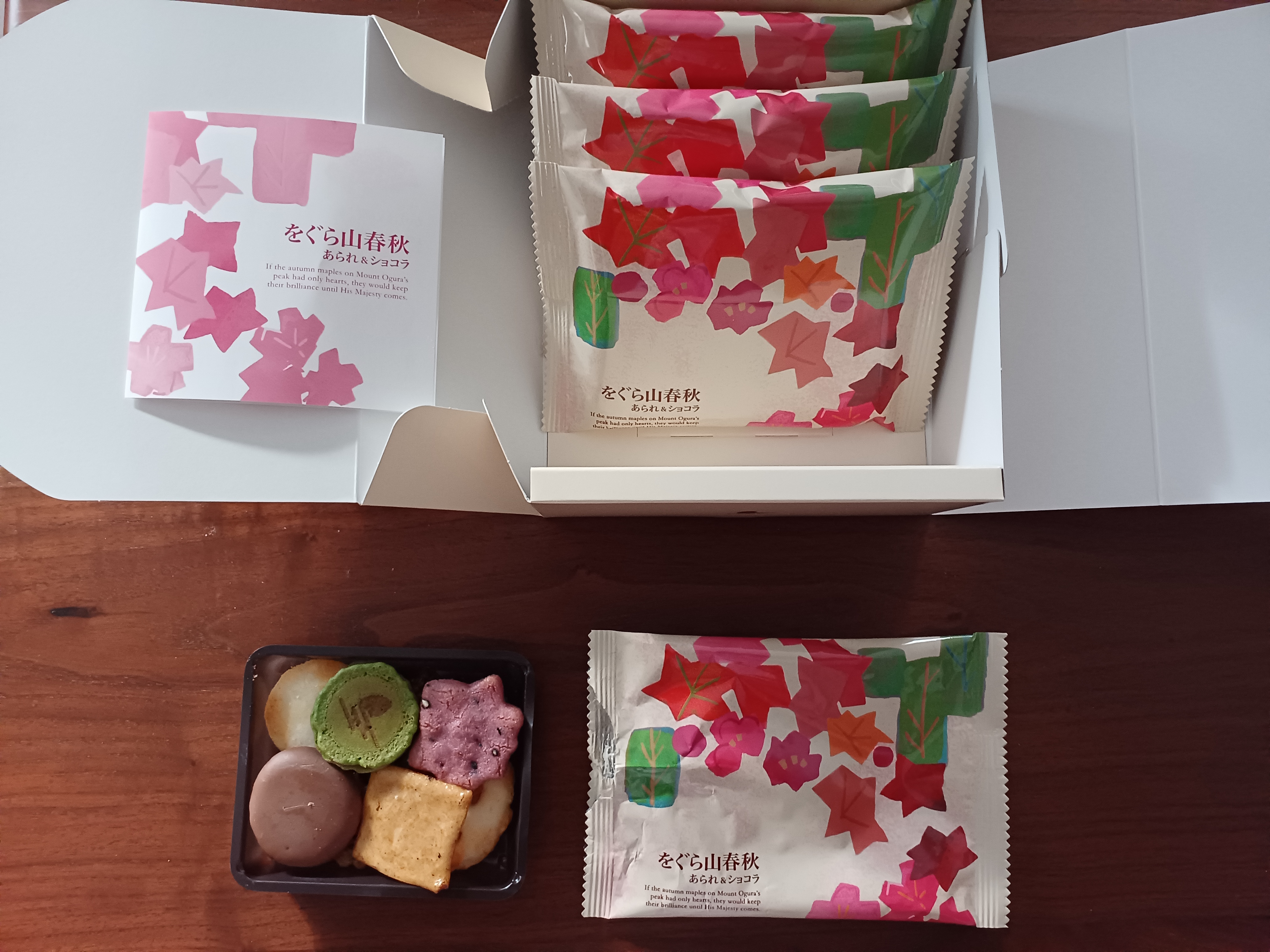 箱を開けると可愛い小袋が4袋きれいに並んでおり、この小さな袋の中に、一口サイズのあられ&ショコラが8種類も入っています。