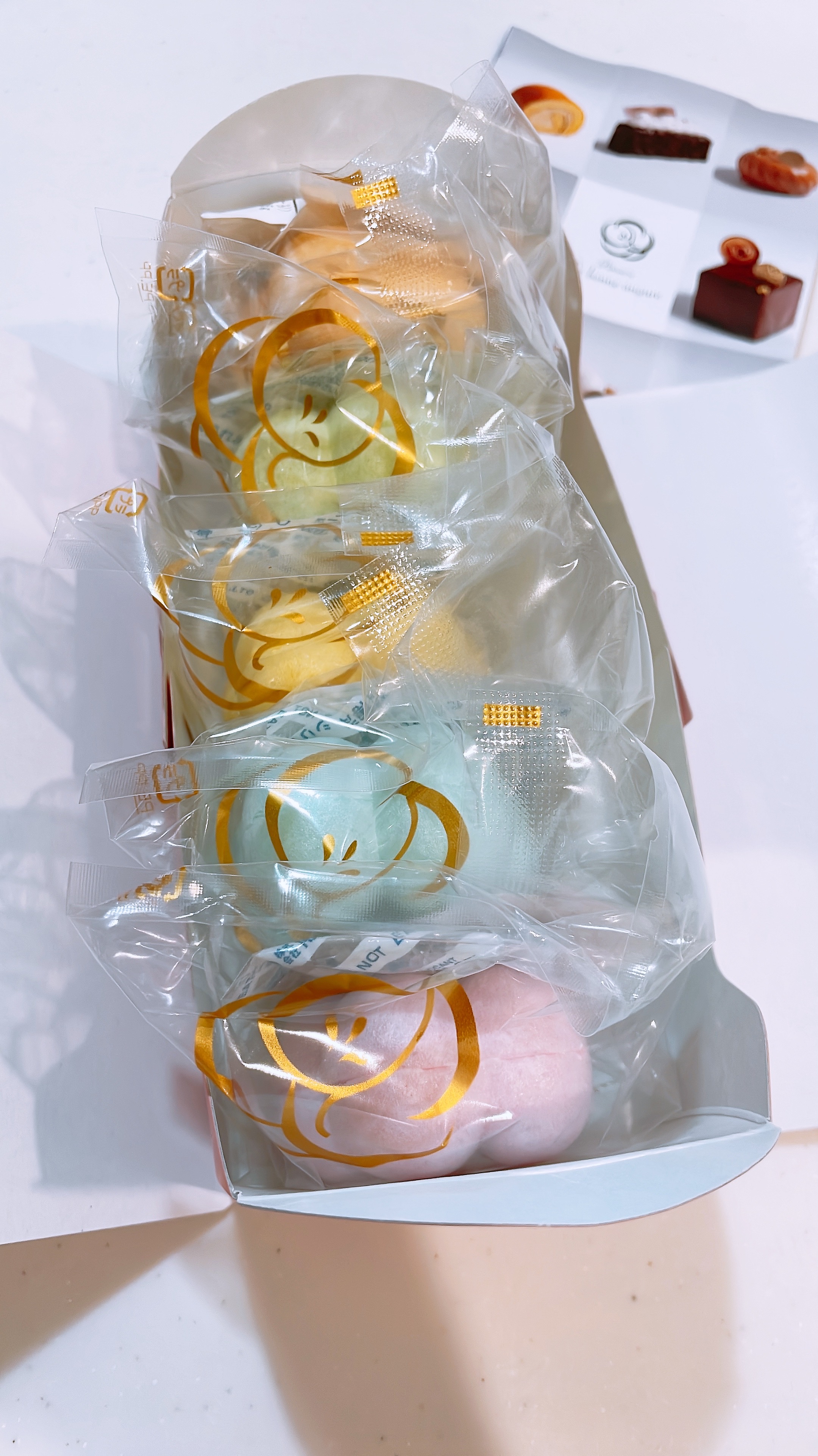 淡いピンク色の箱の中には、優しい色合いのもなかマシュマロが5つ入っています。