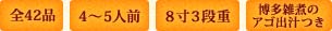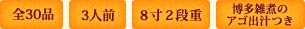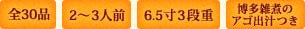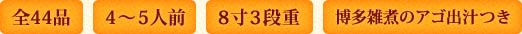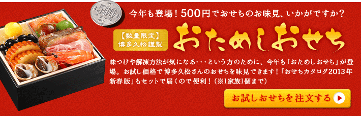 おためしおせち 500円和洋折衷の食材が44品も詰め込まれた、博多久松さん1番人気のおせちです。職人さんたちが厳選した最高の食材と、それぞれの食材の旨みを引き立てる至高の出汁。量も味も大満足、大人気の本格料亭おせちは、家族みんなが揃うお正月にピッタリですね。