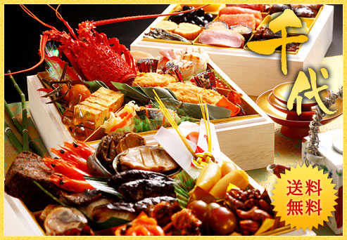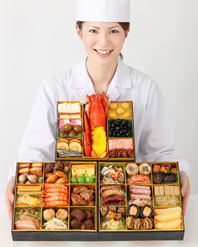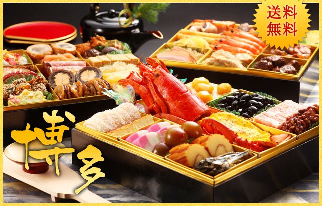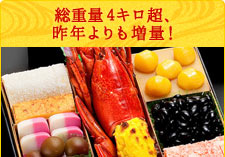 数の子や伊達巻など、伝統的なおせちの食材にとくにこだわったお重です。“春日”と比べ甘みのある食材は少なく、伊勢海老黄金焼など大人好みの食材が特長です。