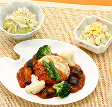 「とうふハンバーグはゴロゴロ野菜たっぷりのラタトゥーユソースが決め手!ご飯もすすみます。副菜のポテトサラダもグリーンピースのペーストで和えてあってひと味違います。炒り卵のトッピングも技あり♪」