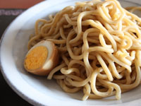 それにすごいでしょ、この自家製極太麺。少し茶色がかった弾力たっぷりの麺は、ゆで上げるのに7~12分かかりますが、噛みしめる程に小麦の風味が力強く感じられます。