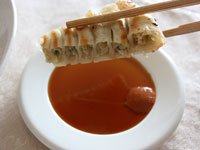 しかし、私が驚いたのはその斬新な形だけではなく、パリパリ&もちもちの皮です。160cmも細長い筒状の皮が続くわけですが(笑)、これなら飽きずに美味しく食べられます。
