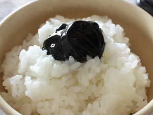 加賀百万石の前田藩主が参勤交代のときに将軍家へ献上し、その美味しさを絶賛されたことが文書に残されているそうですよ。さぁ、いったいこの真っ黒なものは何なのかというと(笑)、いわゆるイカの塩辛にイカ墨を入れて、黒くしたものになんです。