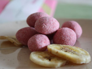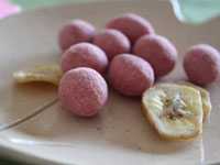 原材料:アーモンド、バナナチップ、脱脂粉乳、砂糖、小麦粉、ブドウ糖、植物油脂、澱粉、還元水飴、苺、餅米粉、など