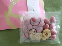 カリっと香ばしい大粒のアーモンドに、ストロベリーのパウダーがたっぷりコーティングされ、ちょっと甘酸っぱい春の味わい。箸休めの如く、甘いバナナチップが添えられているのも嬉しいですね。辻口さんは、豆は栄養豊富で保存に優れた天然のサプリメントと捉え、繊細なスィーツのように美しく手軽に味わってもらえたらと考えたそうで...。確かにただのナッツだとお酒のつまみみたいだし、職場で女性がちょっと口にするには絶対こっちの方が見栄えが良い(笑)!しかも可愛くってテンションも上がりますしね☆