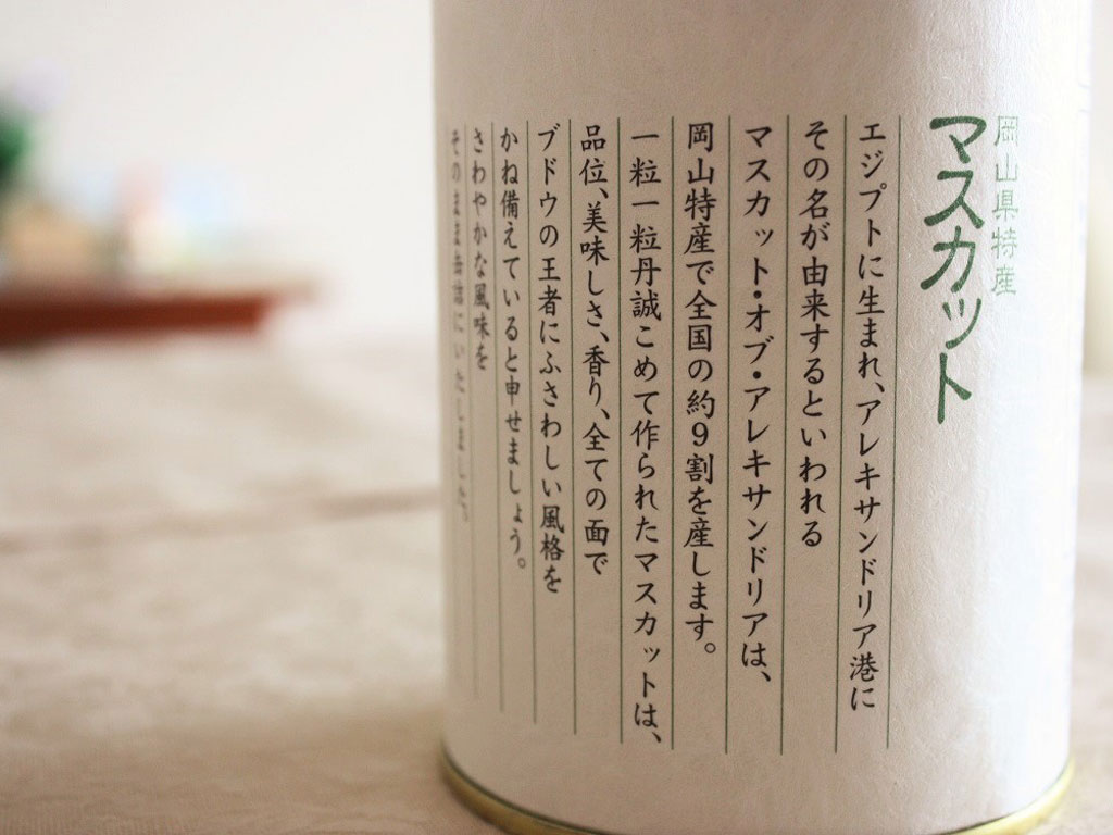 こちらは岡山の老舗果物加工メーカーの直営店が販売しており、そのフルーツ愛に溢れたHPから幾つかトリビアをご紹介しますと・・・岡山はマスカットの全国生産量9割を占めるんですって。また正式名称は「マスカット・オブ・アレキサンドリア」と言うそうで、原産地エジプトのアレキサンドリア港がその名の由来だとか。