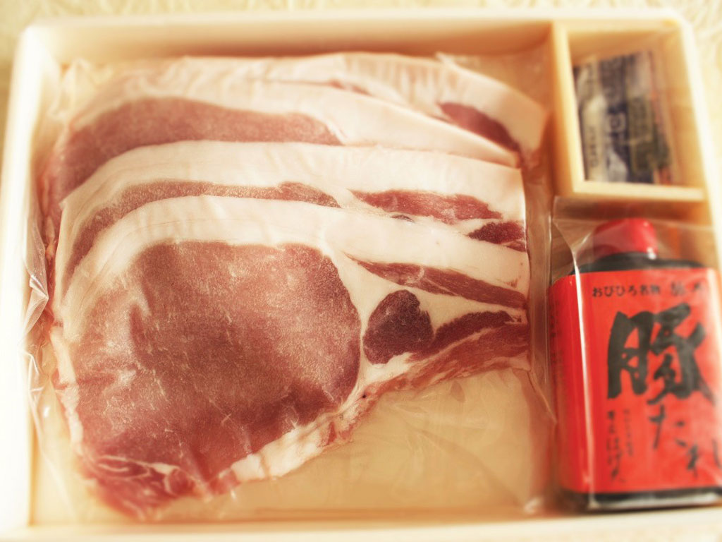 届いた箱を開けると、サシが入った美しいピンク色の特上ロース肉(たっぷり280g♪)と、秘伝のタレが同包されています。昔から養豚が盛んな道東地方の、厳しい自然で磨かれたこの道産豚は一般には手に入らない高品質のものだそうで、キメが細かく火を入れても柔らかい!