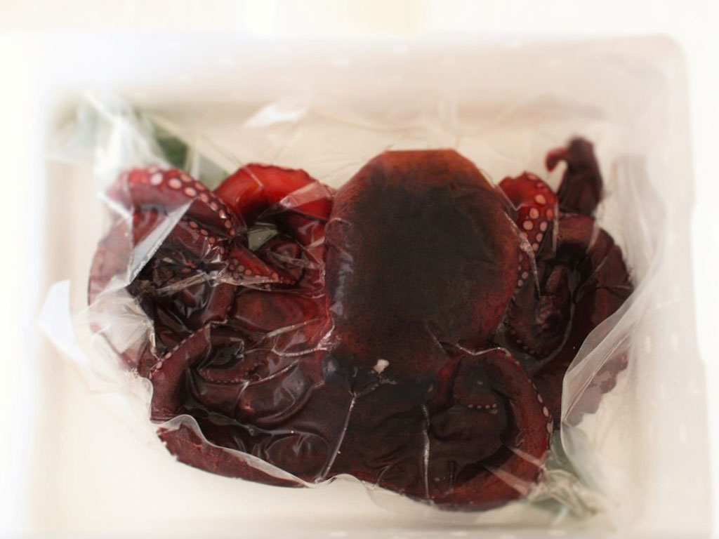 「ゆでダコ」そのものが商品ですから、ストレートに美味しさと新鮮さがウリ。瀬戸大橋の麓、下津井のタコ漁師「七福丸」の山﨑さんが早朝3時頃から水揚げしたという真タコは、潮の流れが強い岩場で育つため、噛みごたえや甘みが抜群なんですって。また「蛸壺」を使った伝統漁法により、身が傷つくことなく鮮度が保たれます。