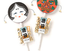片面が鬼、裏面がお多福のでんでん太鼓に、北海道産の大豆をセットにして☆